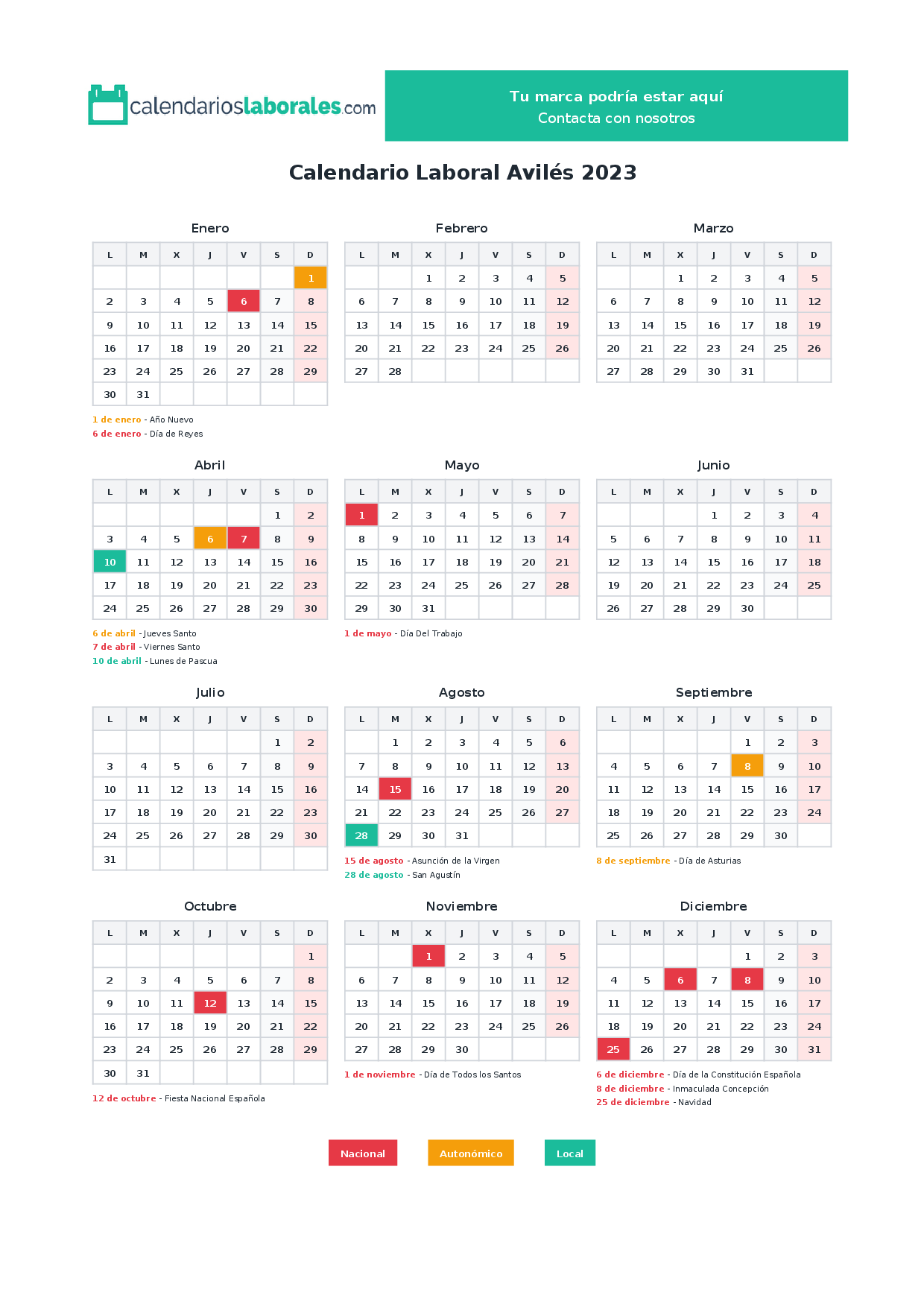 Calendario laboral Avilés 2023
