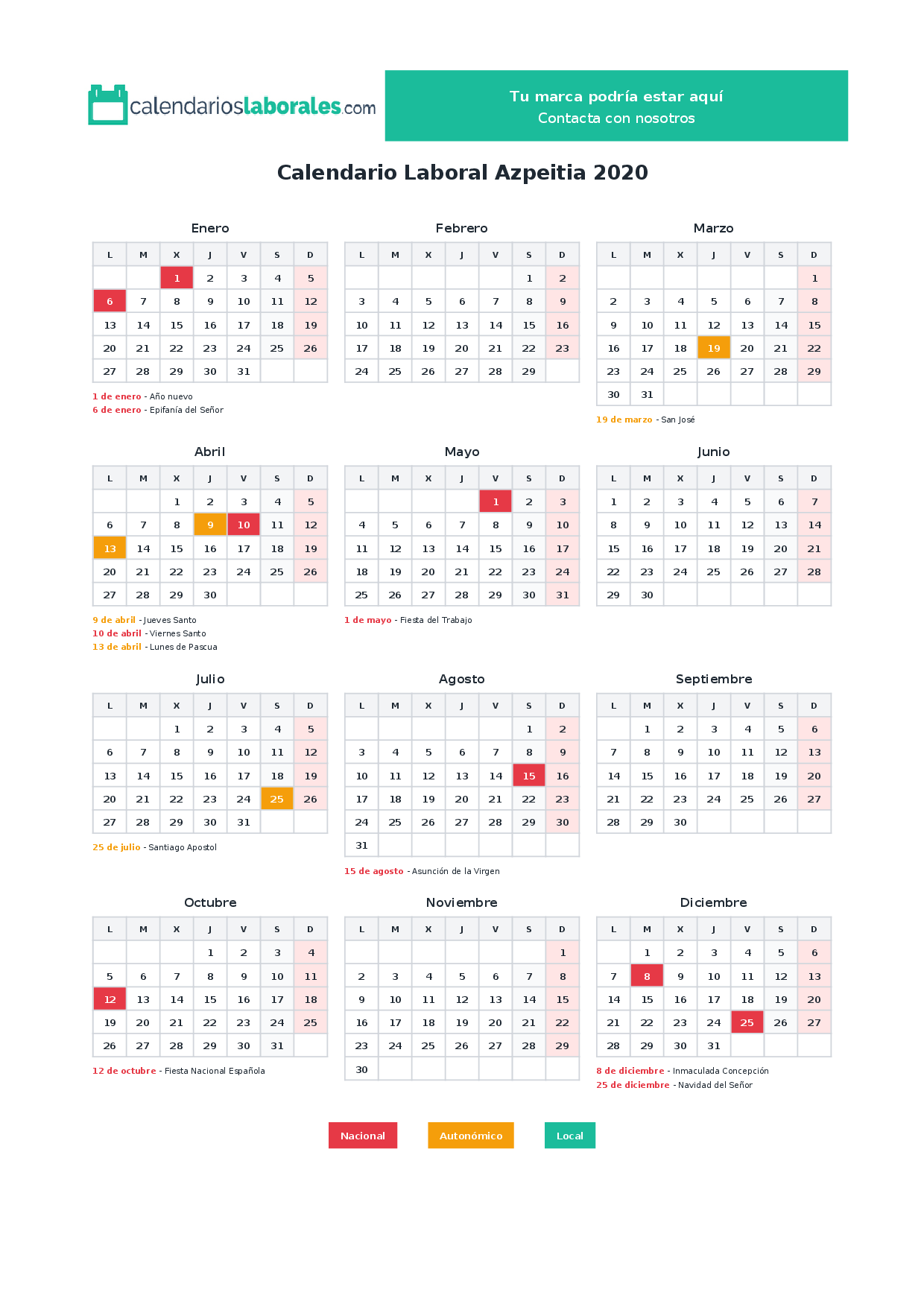En 2020, 8 festivos nacionales se celebran en todo el territorio español, incluidos en el calendario laboral de Azpeitia.