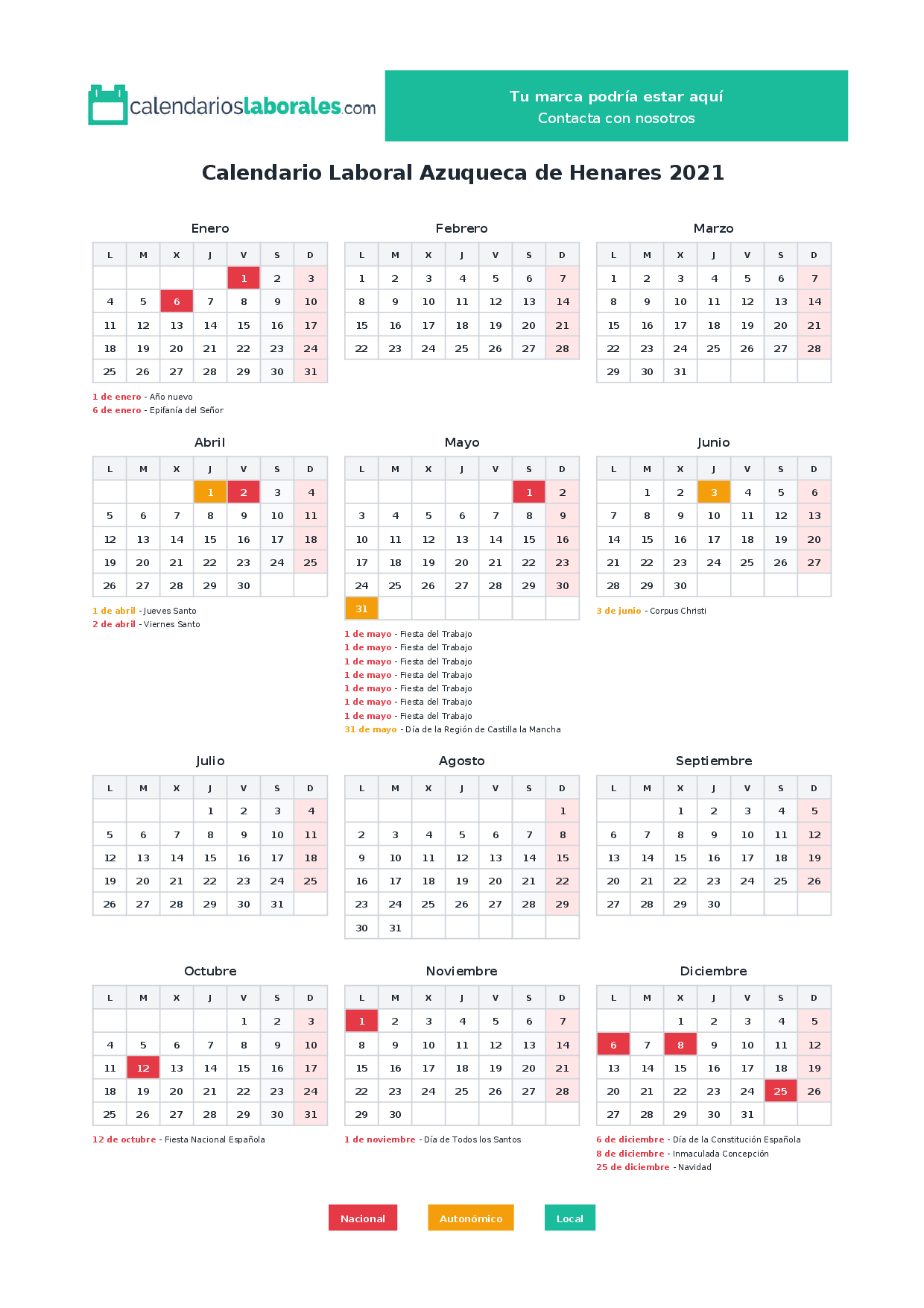 Calendario laboral Azuqueca de Henares 2021