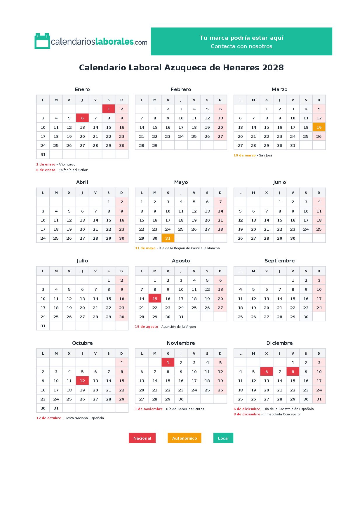 El calendario laboral de Azuqueca de Henares en 2028 incluye un total de 9 días festivos, que combinan festivos nacionales, festivos autonómicos de Castilla La Mancha y los festivos locales propios del municipio.