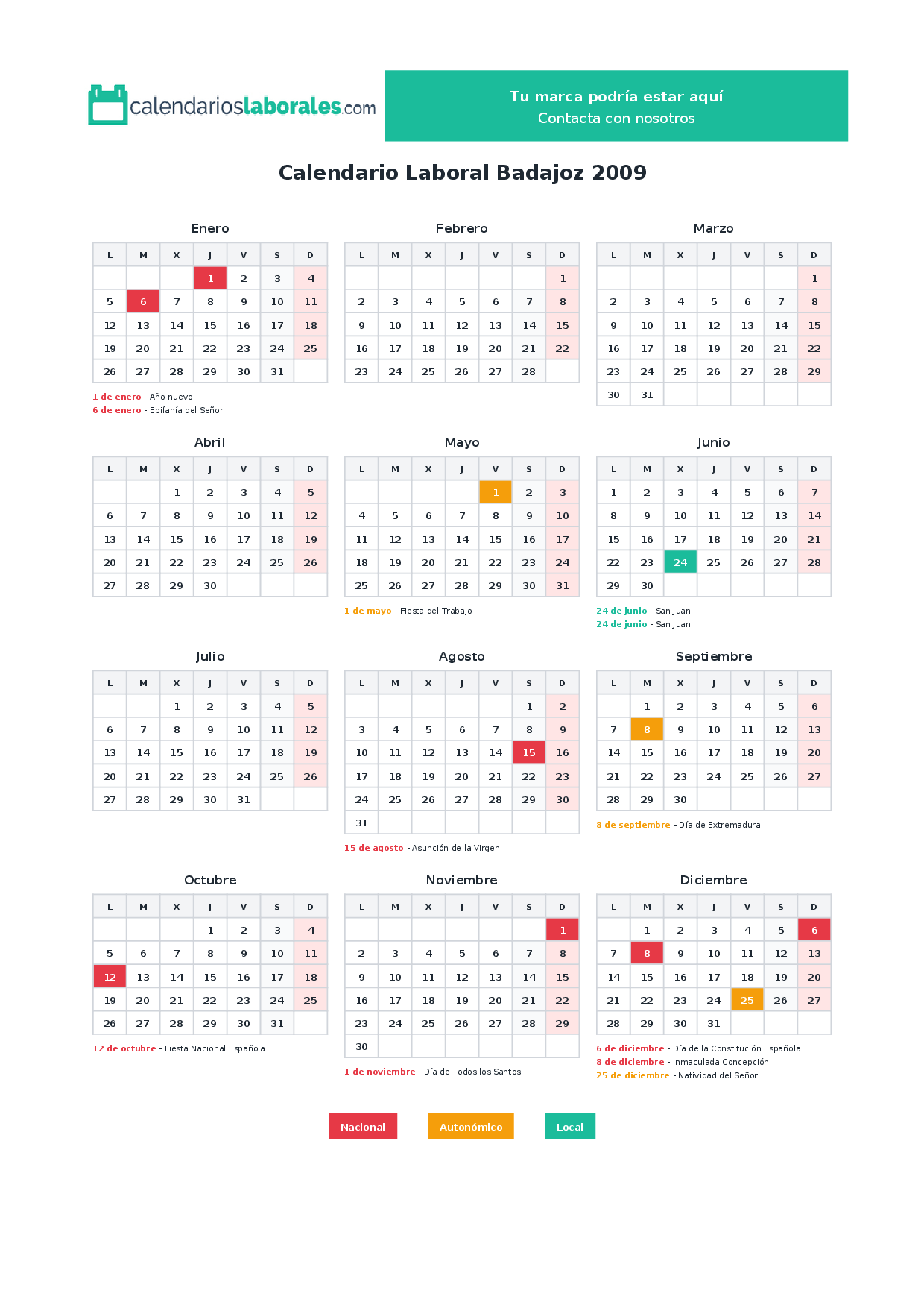 Puedes consultar también el calendario laboral completo de Extremadura 2009 o el calendario laboral de España para conocer el detalle nacional.