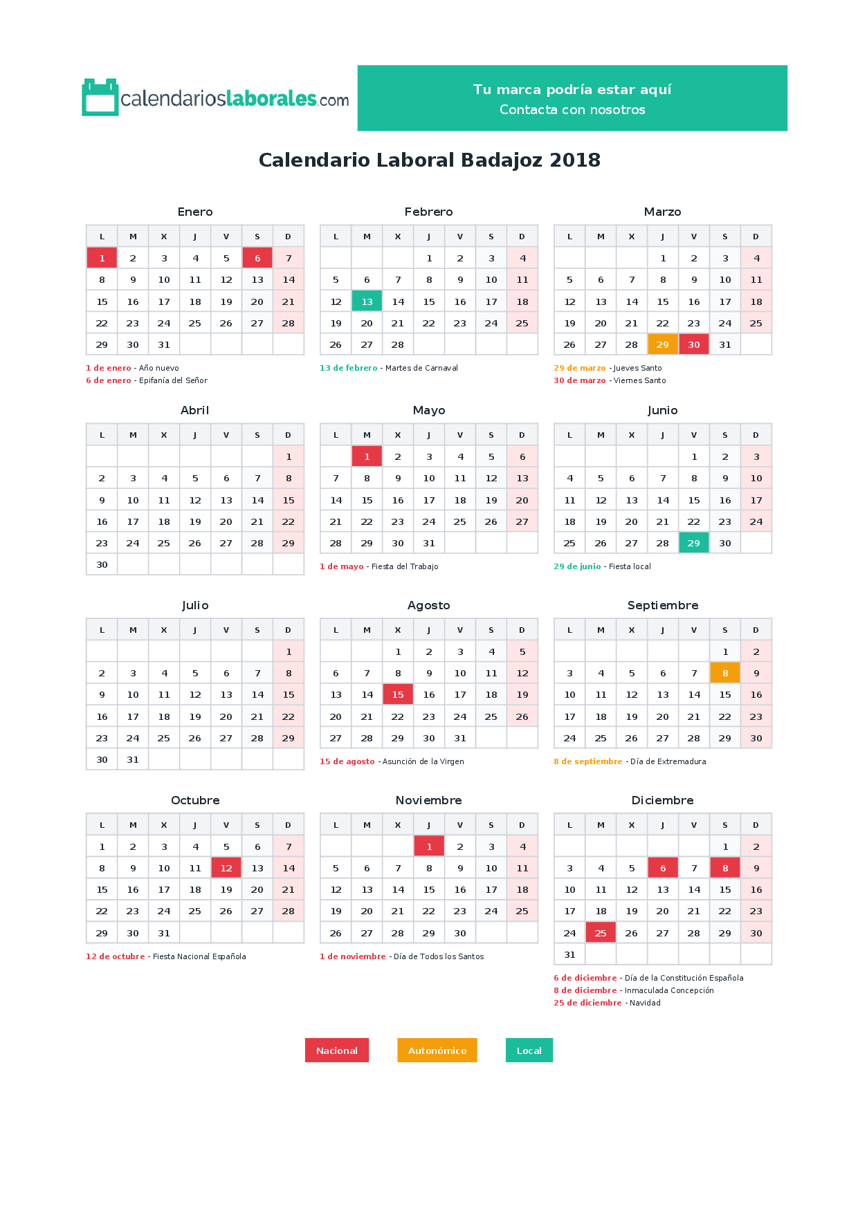 Puedes consultar también el calendario laboral completo de Extremadura 2018 o el calendario laboral de España para conocer el detalle nacional.