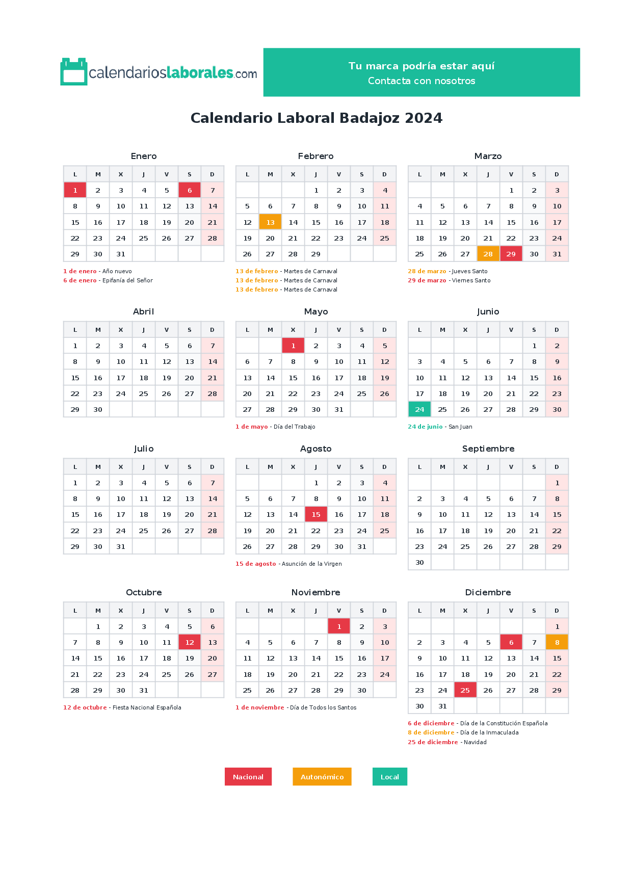 Calendario laboral Badajoz 2024