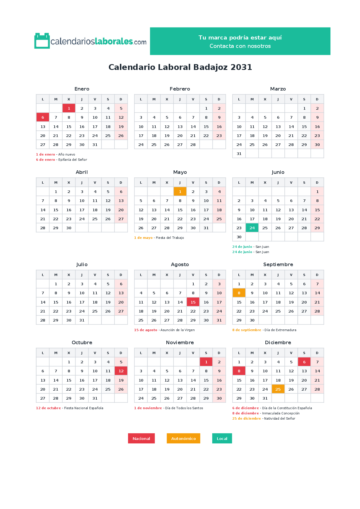 El calendario laboral de Badajoz en 2031 cuenta con un total de 11 días festivos, que incluyen festivos nacionales, festivos autonómicos de Extremadura y los festivos locales establecidos por cada municipio.