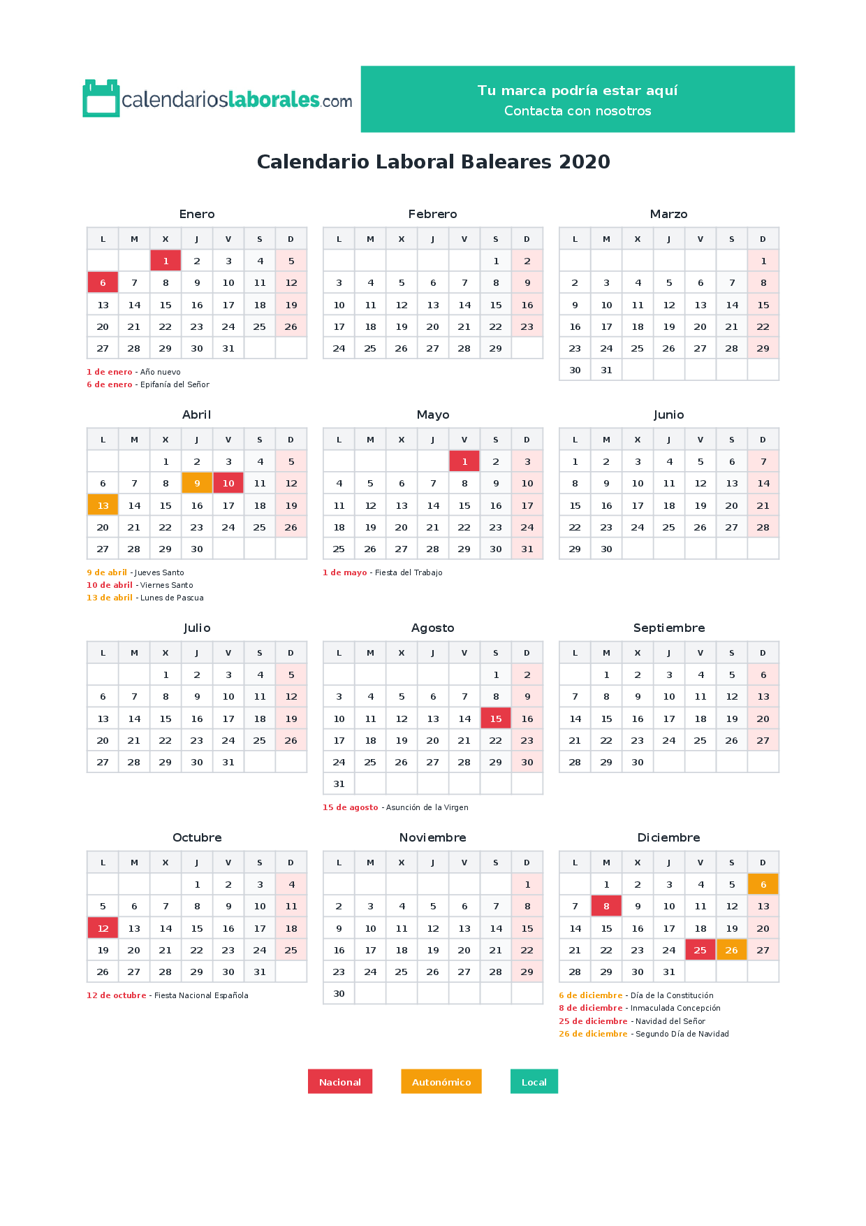 Festivos nacionales en Baleares 2020