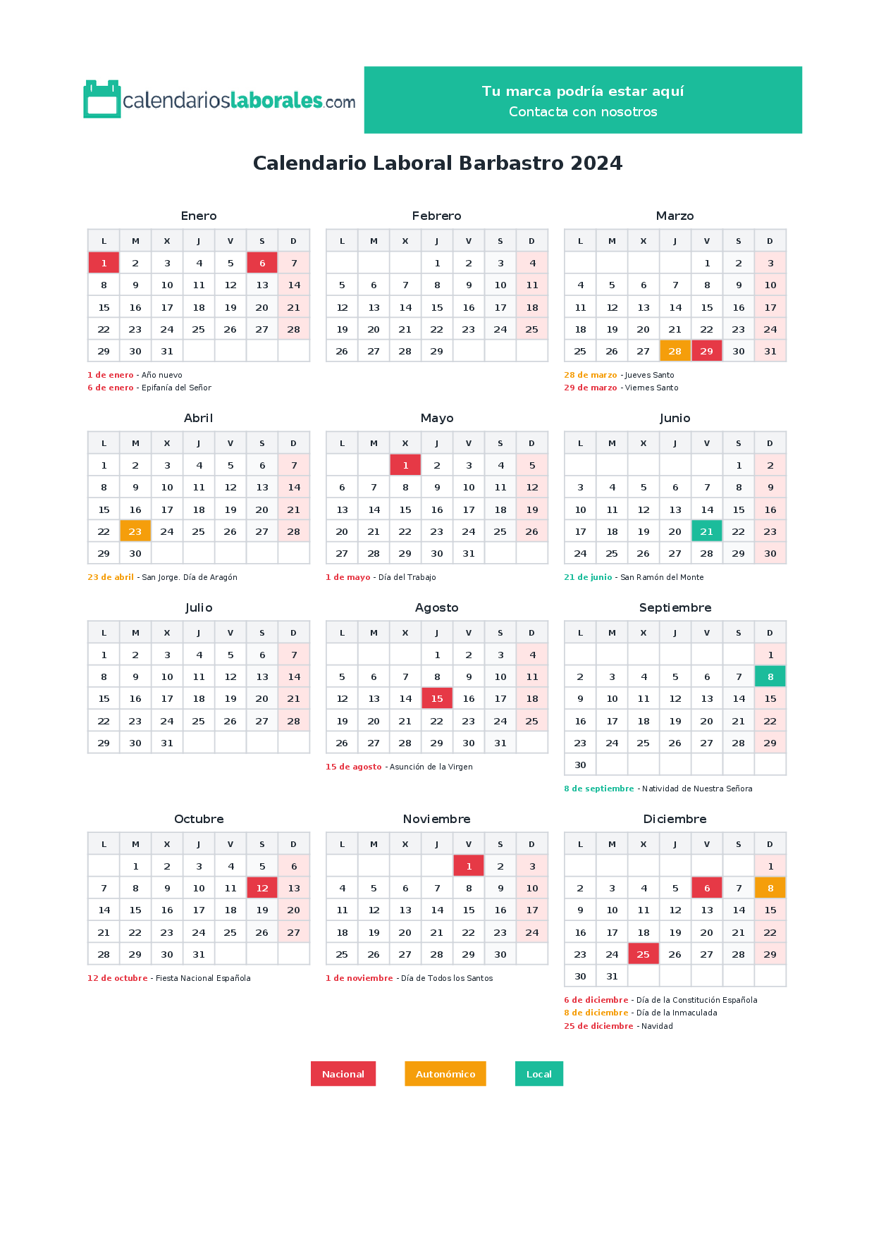 El calendario laboral de Barbastro en 2024 incluye un total de 14 días festivos, que combinan festivos nacionales, festivos autonómicos de Aragón y los festivos locales propios del municipio.