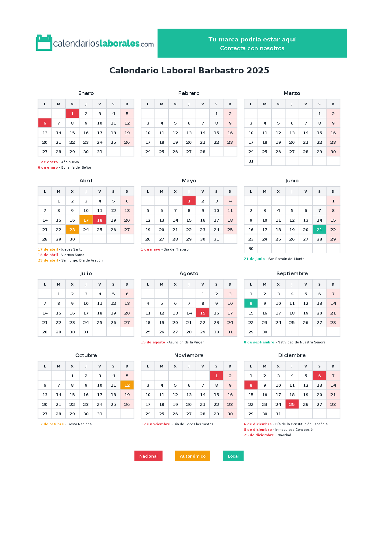Además, el Ayuntamiento de Barbastro fija 2 festivos locales que completan el calendario laboral del municipio.