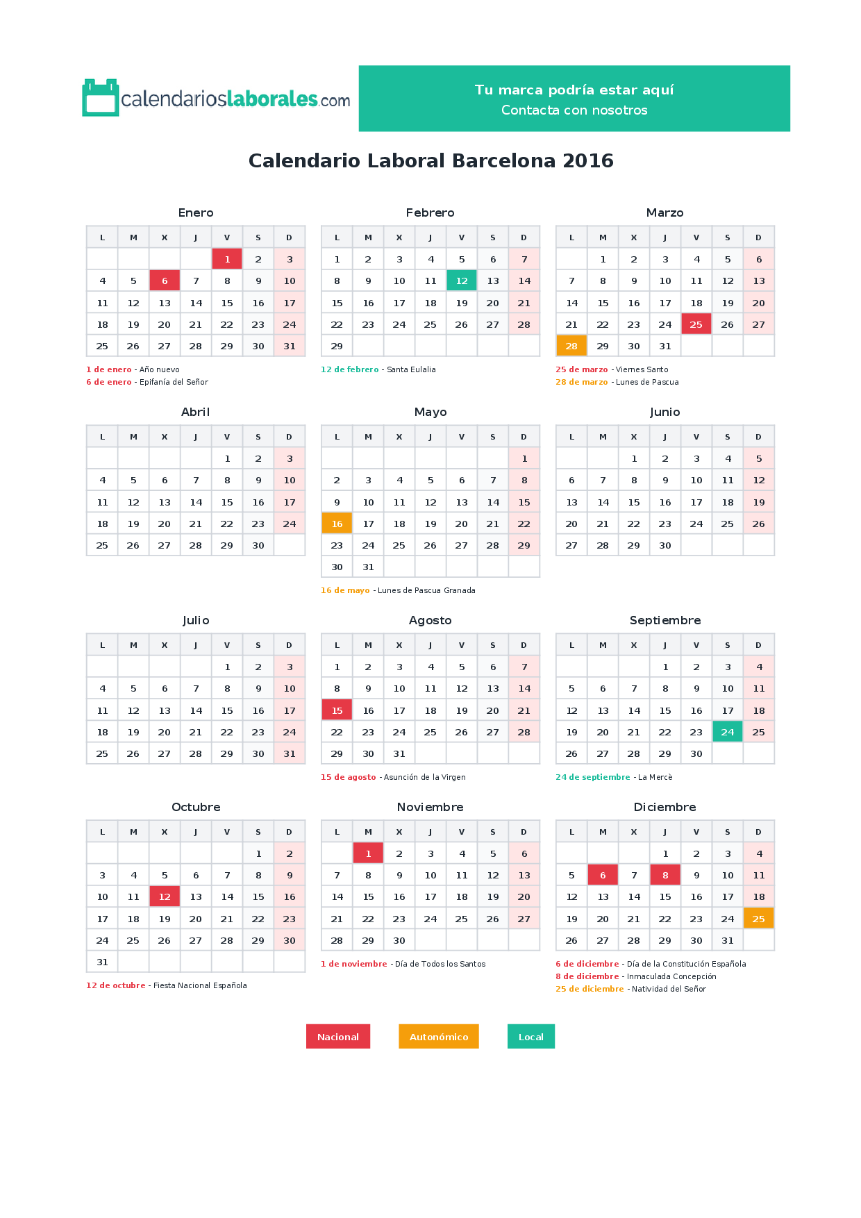 El calendario laboral de Barcelona en 2016 cuenta con un total de 13 días festivos, que incluyen festivos nacionales, festivos autonómicos de Cataluña y los festivos locales establecidos por cada municipio.