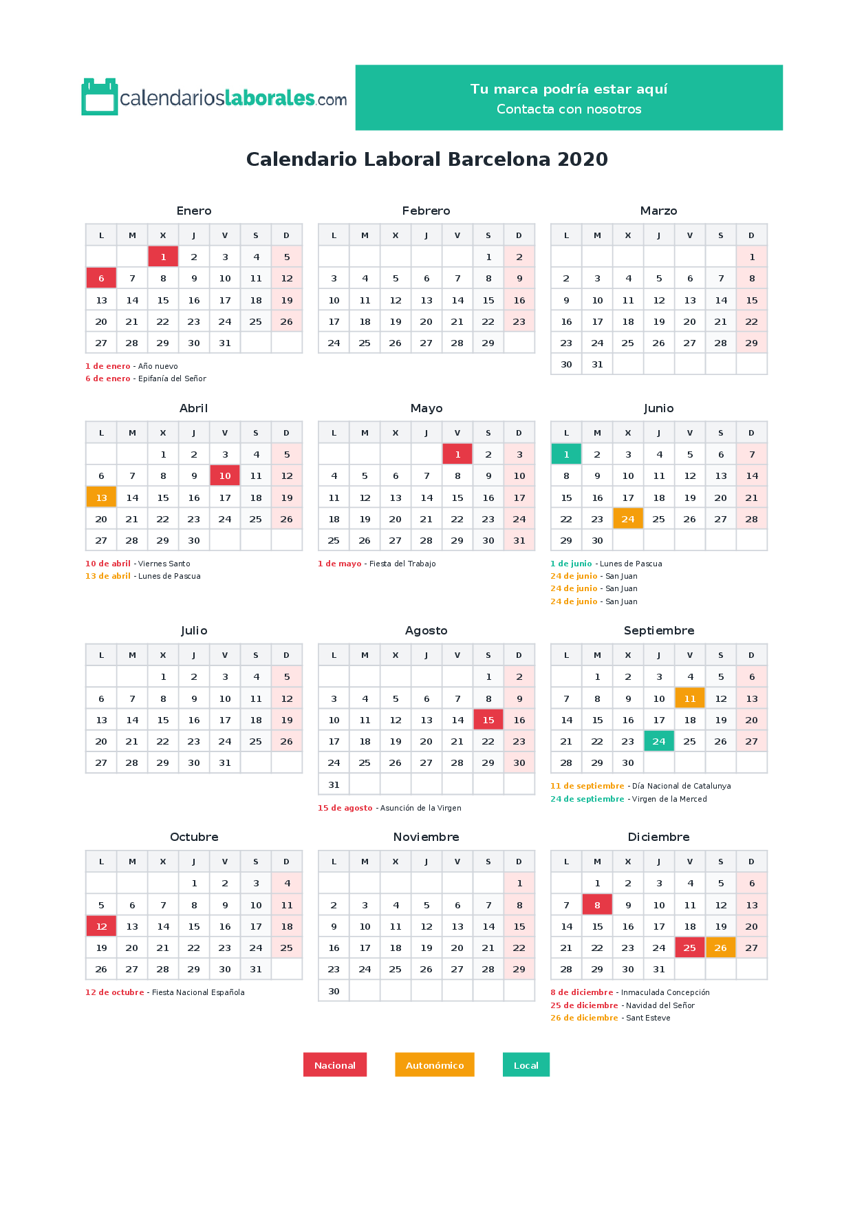 El calendario laboral de Barcelona en 2020 cuenta con un total de 14 días festivos, que incluyen festivos nacionales, festivos autonómicos de Cataluña y los festivos locales establecidos por cada municipio.