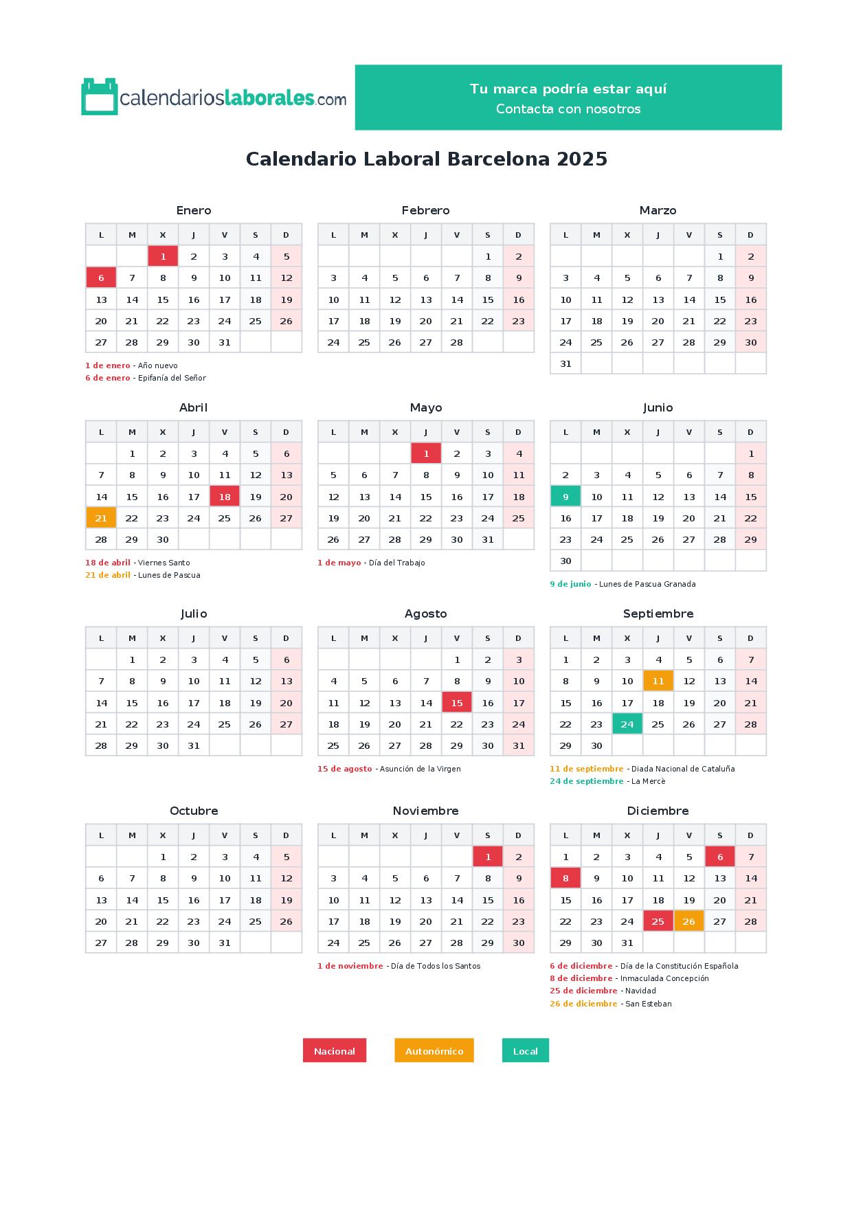 El calendario laboral de Barcelona en 2025 cuenta con un total de 14 días festivos, que incluyen festivos nacionales, festivos autonómicos de Cataluña y los festivos locales establecidos por cada municipio.