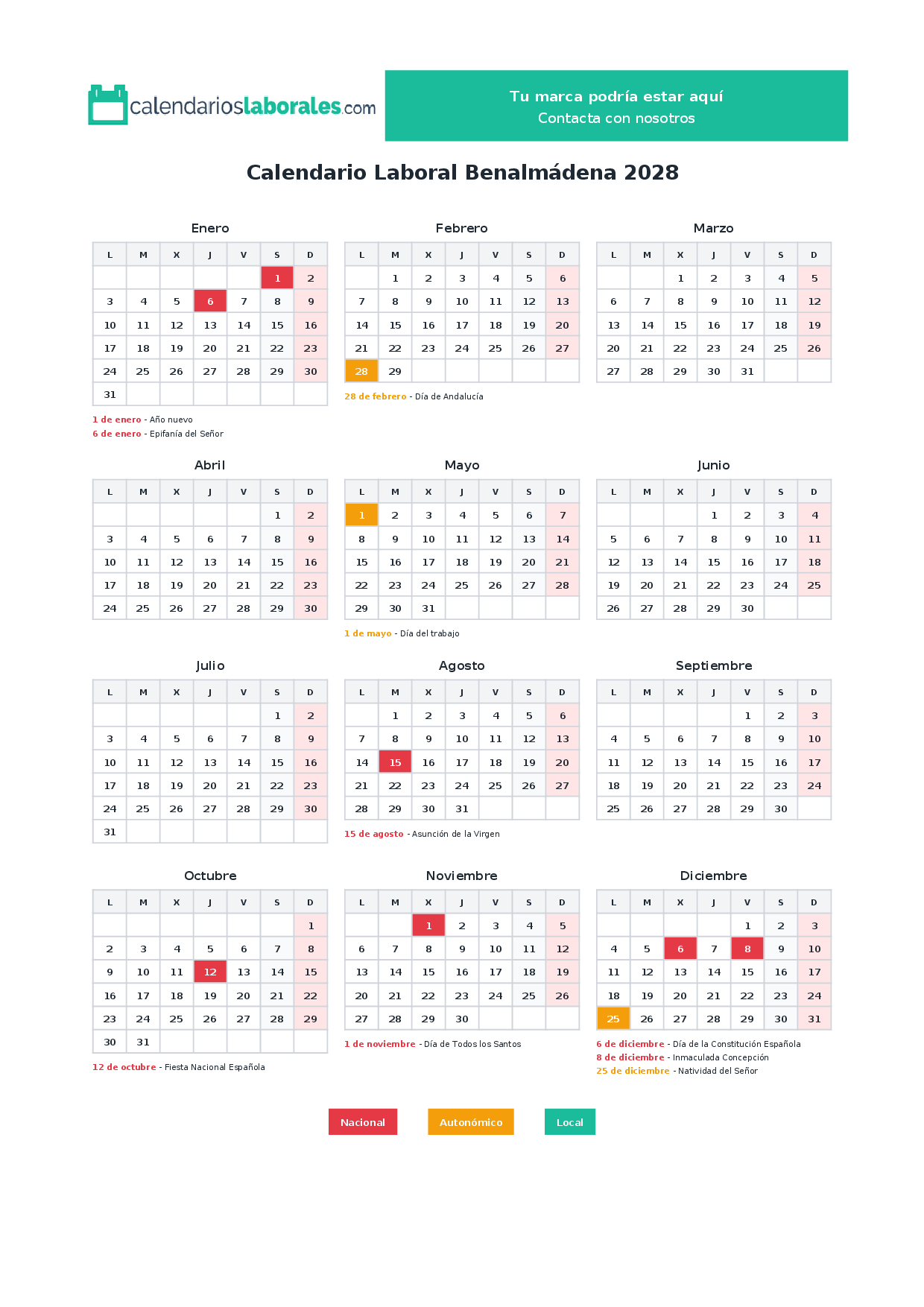 El calendario laboral de Benalmádena en 2028 incluye un total de 10 días festivos, que combinan festivos nacionales, festivos autonómicos de Andalucía y los festivos locales propios del municipio.