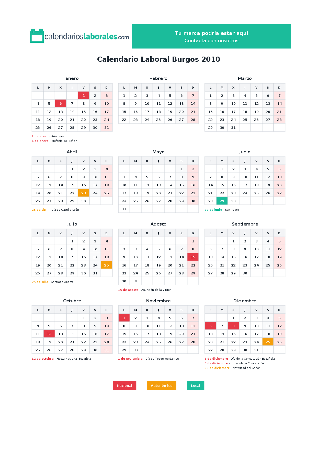 El calendario laboral de Burgos en 2010 cuenta con un total de 11 días festivos, que incluyen festivos nacionales, festivos autonómicos de Castilla León y los festivos locales establecidos por cada municipio.