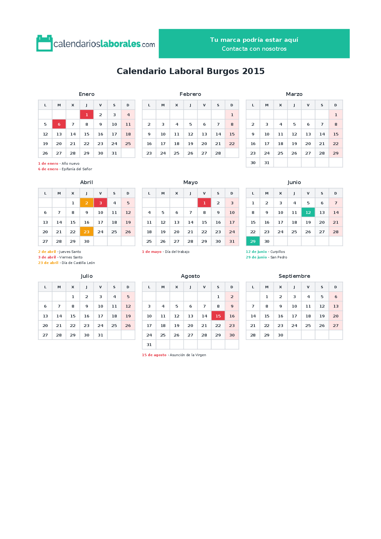 El calendario laboral de Burgos en 2015 cuenta con un total de 14 días festivos, que incluyen festivos nacionales, festivos autonómicos de Castilla León y los festivos locales establecidos por cada municipio.