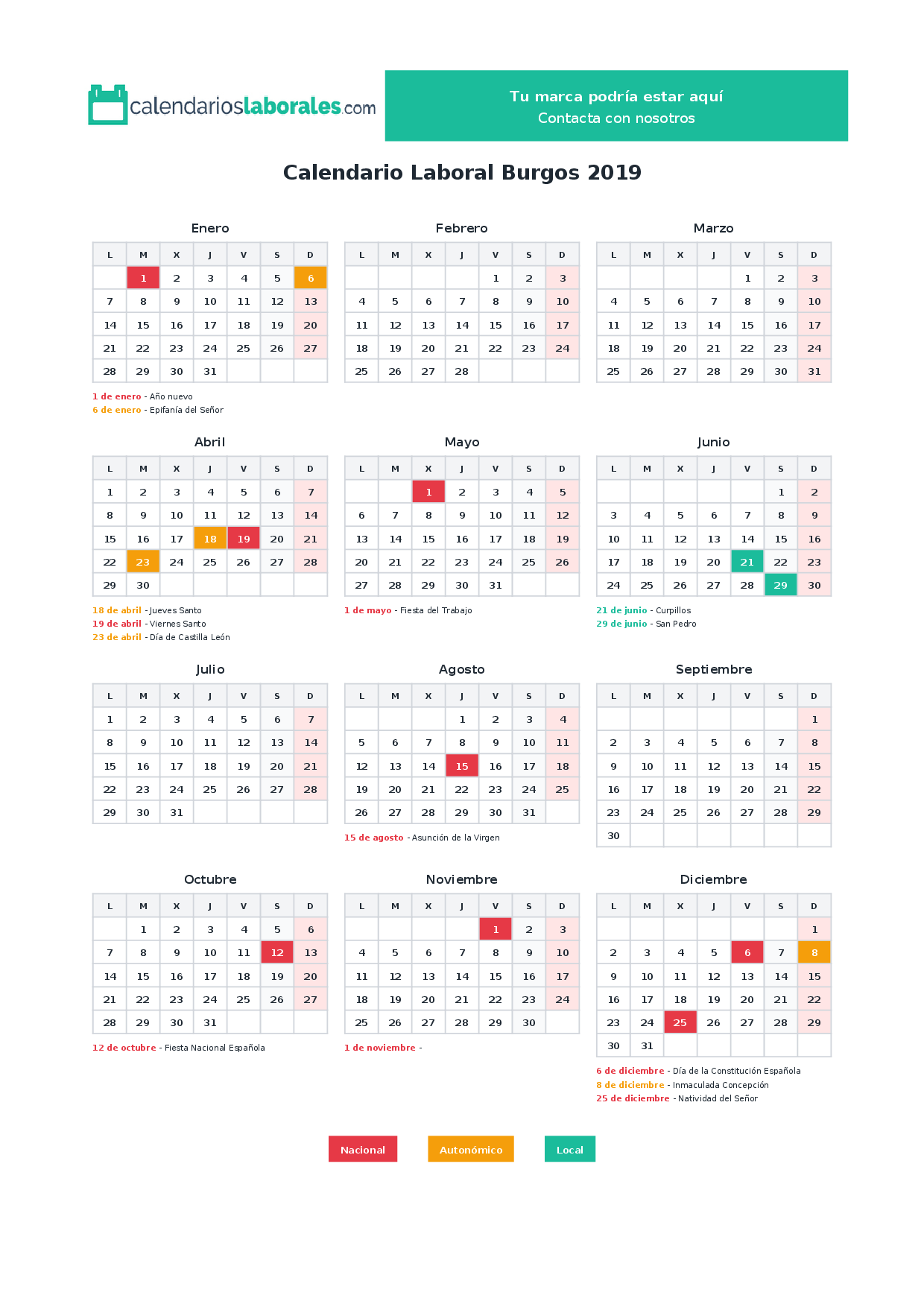 El calendario laboral de Burgos en 2019 cuenta con un total de 14 días festivos, que incluyen festivos nacionales, festivos autonómicos de Castilla León y los festivos locales establecidos por cada municipio.