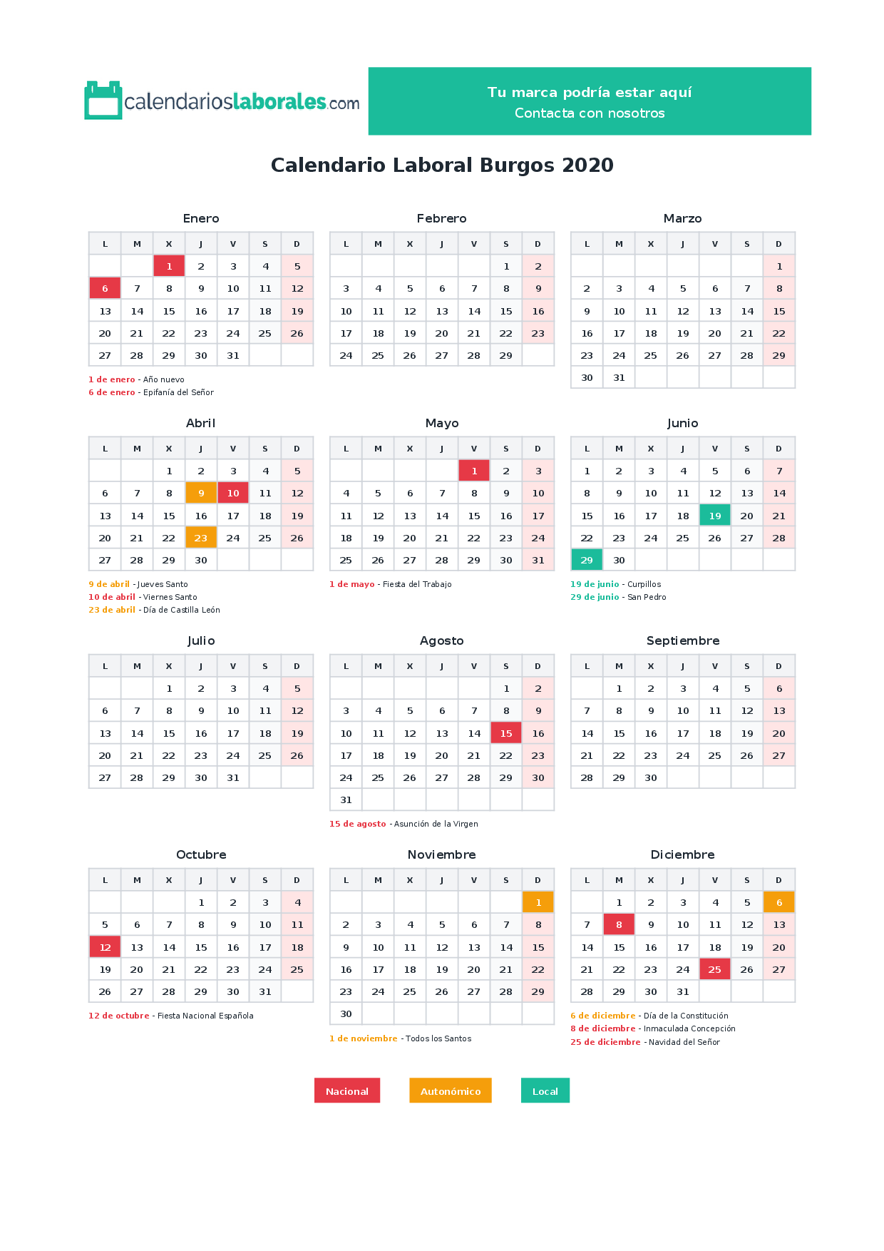 El calendario laboral de Burgos en 2020 cuenta con un total de 14 días festivos, que incluyen festivos nacionales, festivos autonómicos de Castilla León y los festivos locales establecidos por cada municipio.