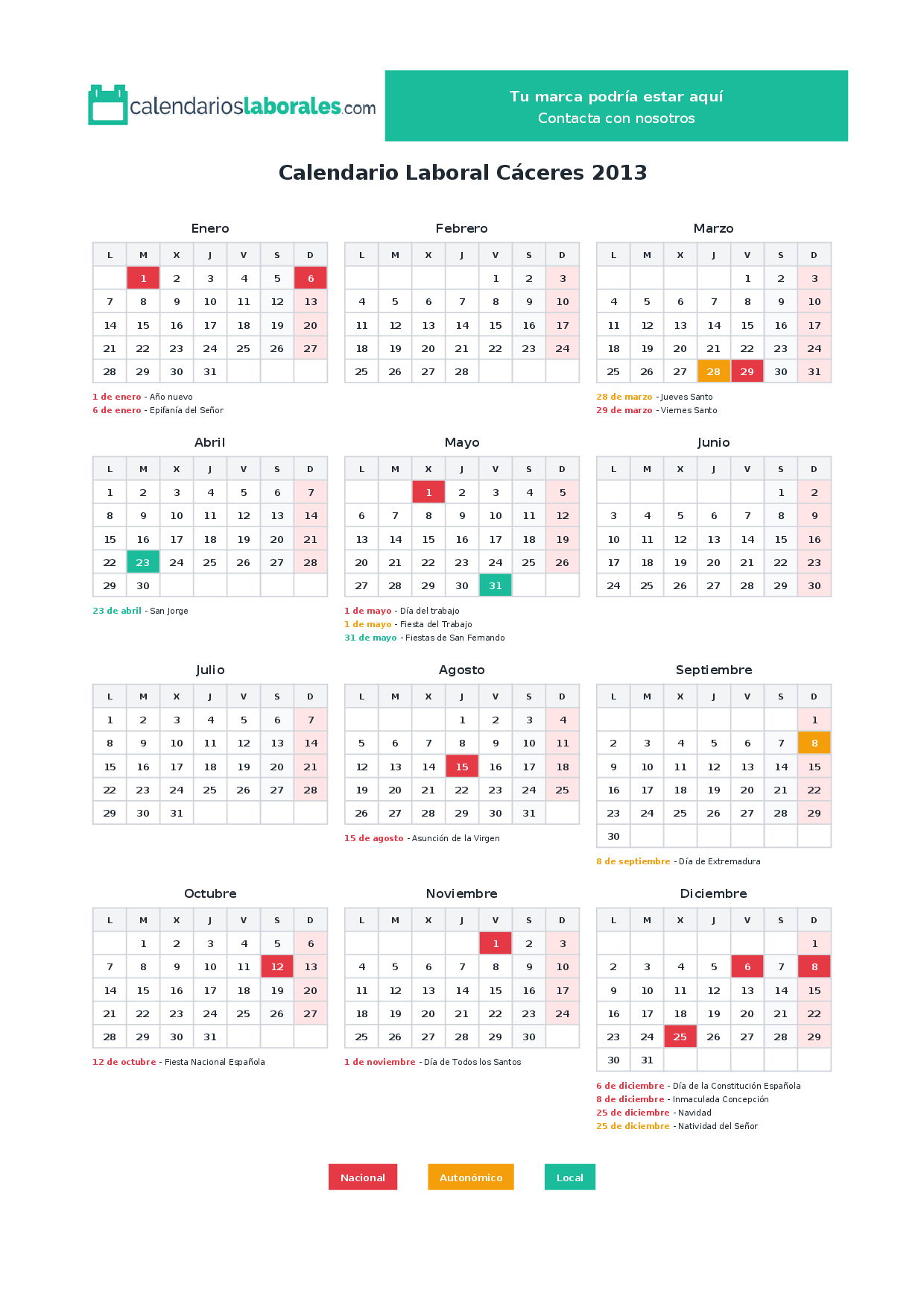 Calendario laboral Cáceres 2013