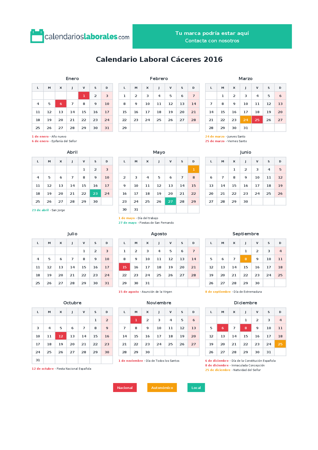 Calendario laboral Cáceres 2016