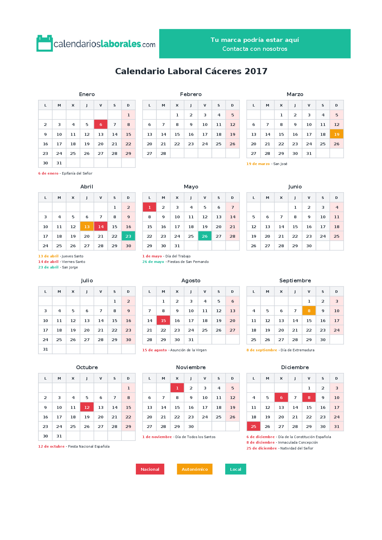 Calendario laboral Cáceres 2017