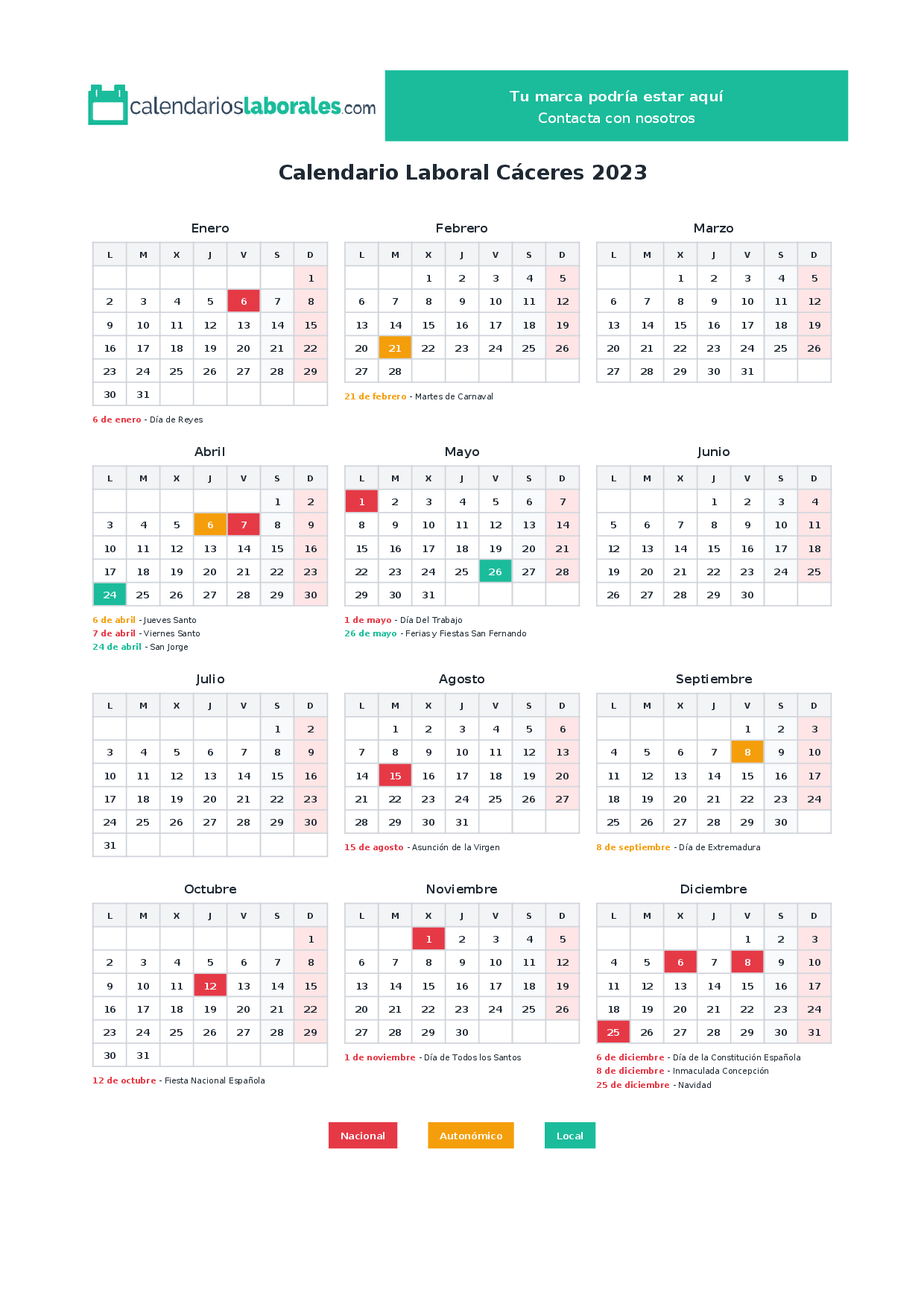 El calendario laboral de Cáceres en 2023 cuenta con un total de 14 días festivos, que incluyen festivos nacionales, festivos autonómicos de Extremadura y los festivos locales establecidos por cada municipio.