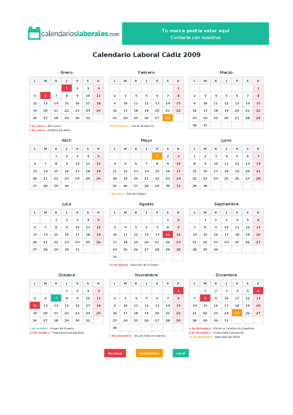 El calendario laboral de Cádiz en 2009 cuenta con un total de 11 días festivos, que incluyen festivos nacionales, festivos autonómicos de Andalucía y los festivos locales establecidos por cada municipio.