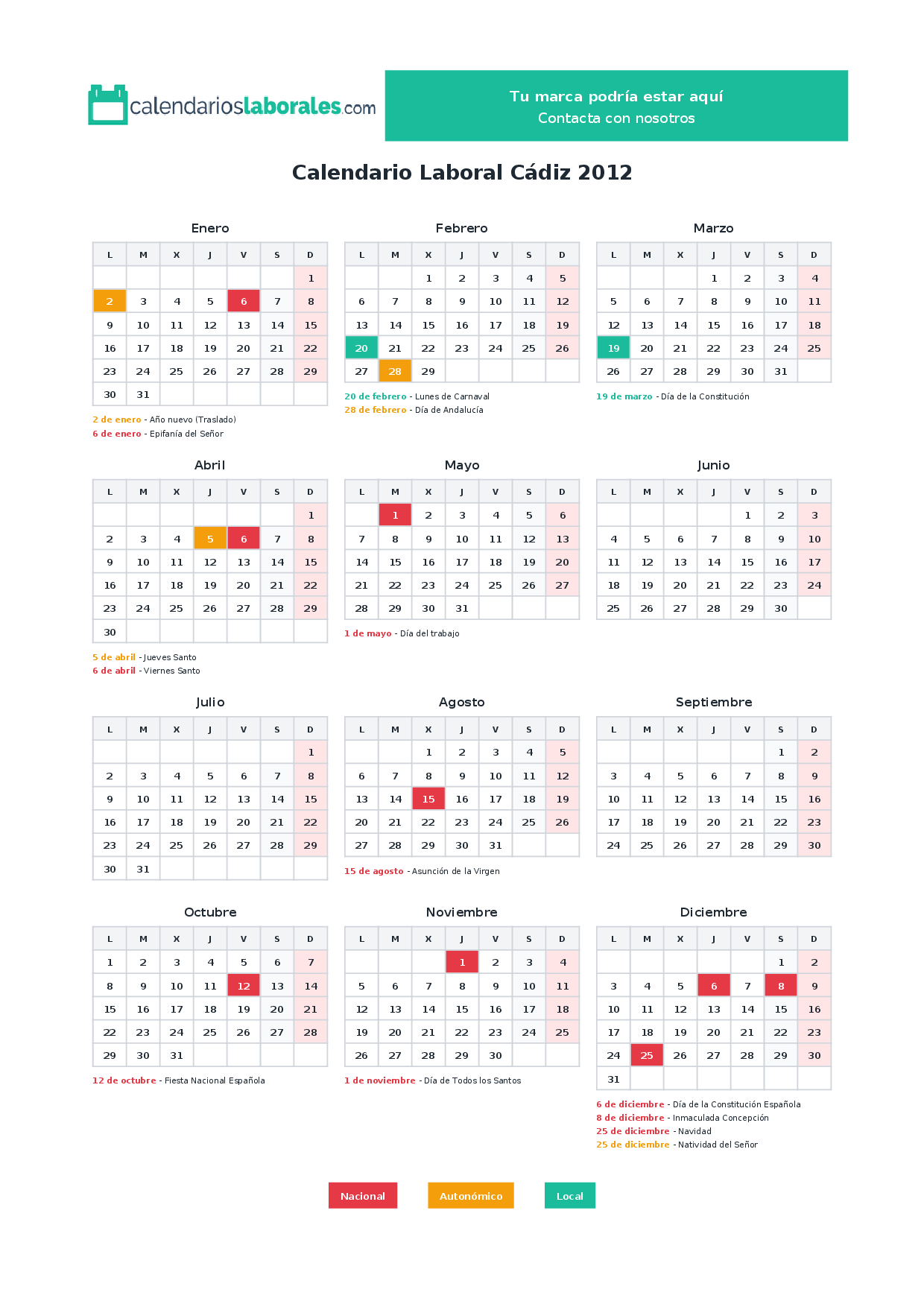 Calendario laboral Cádiz 2012