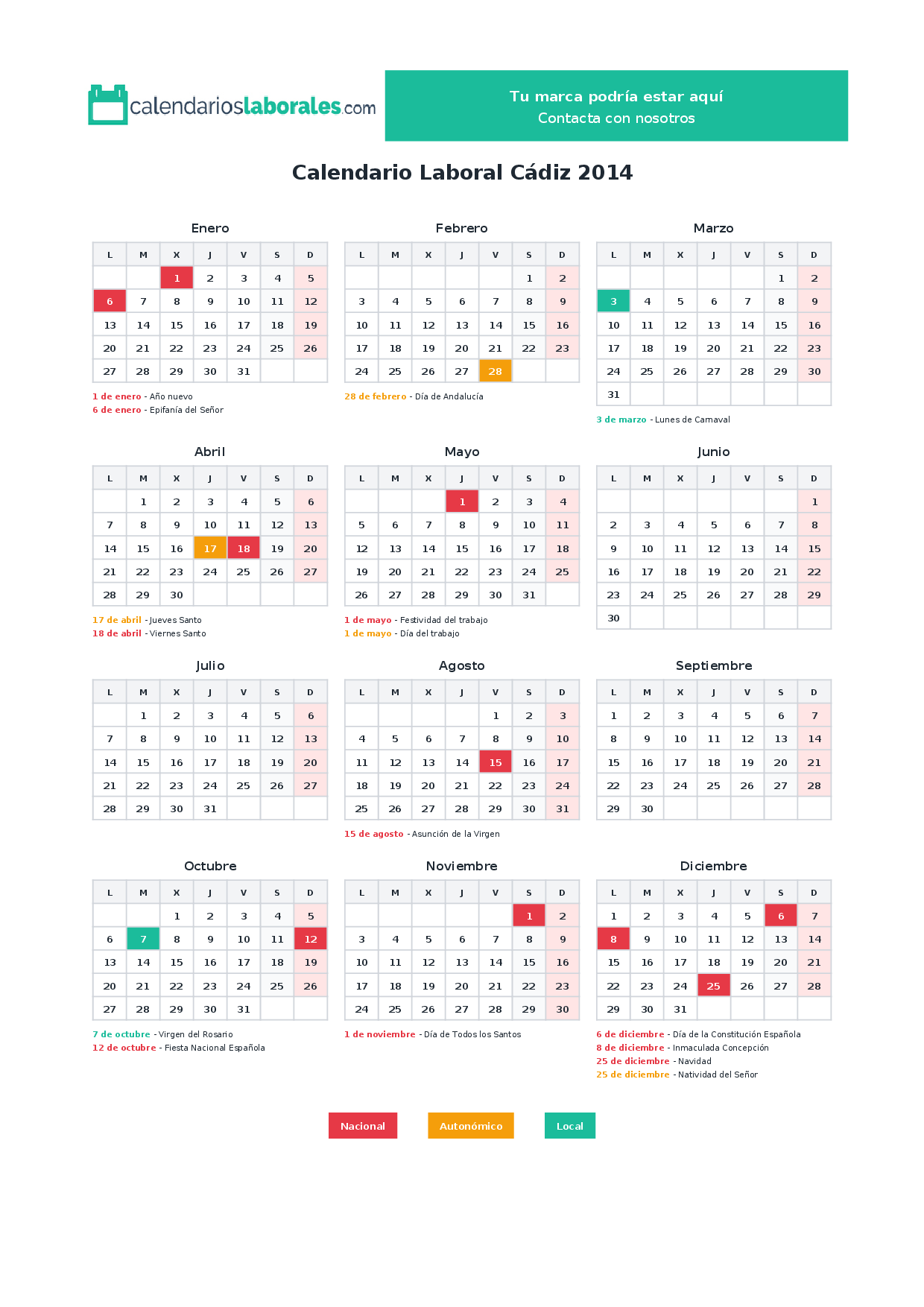 El calendario laboral de Cádiz en 2014 cuenta con un total de 14 días festivos, que incluyen festivos nacionales, festivos autonómicos de Andalucía y los festivos locales establecidos por cada municipio.