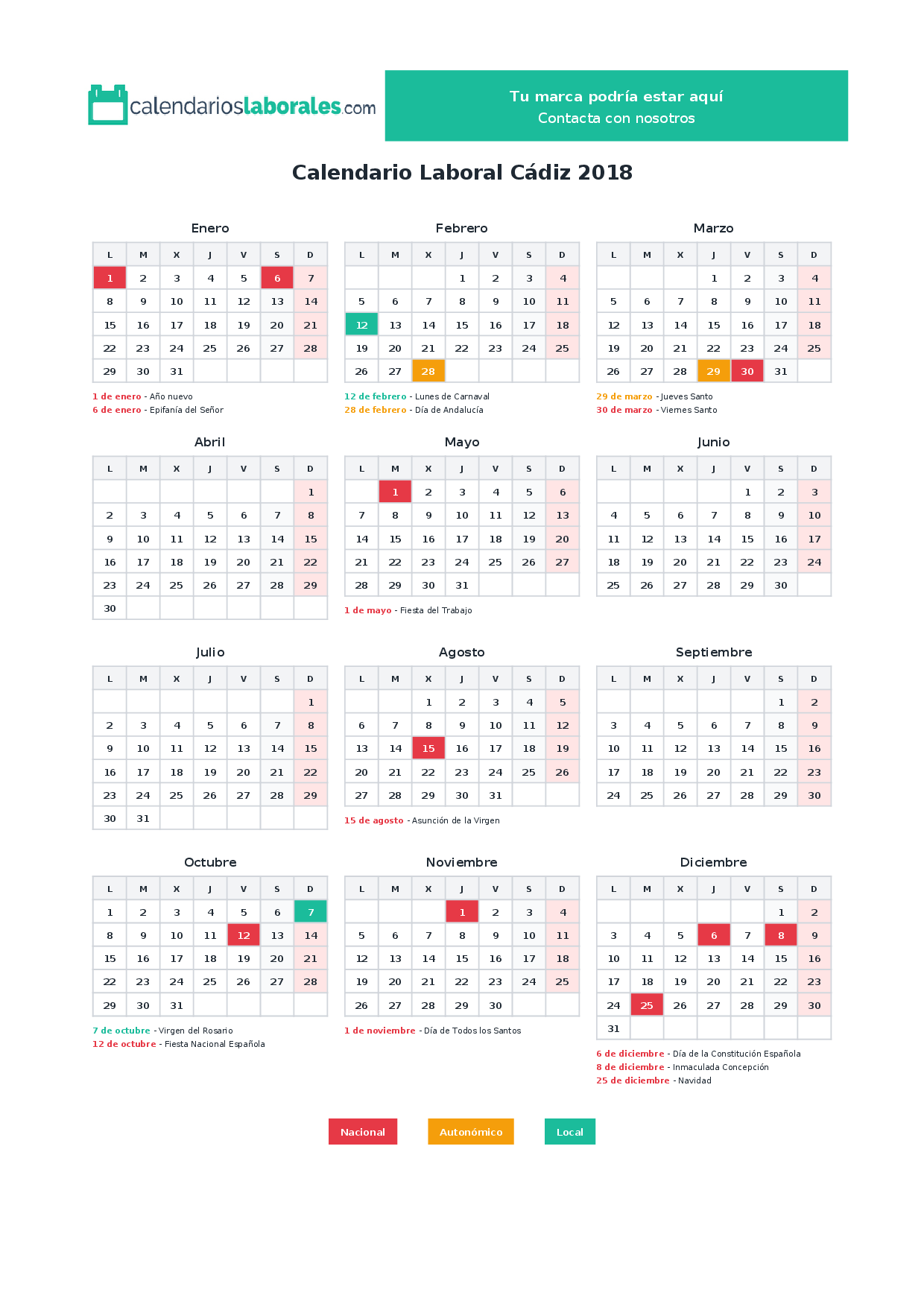 El calendario laboral de Cádiz en 2018 cuenta con un total de 14 días festivos, que incluyen festivos nacionales, festivos autonómicos de Andalucía y los festivos locales establecidos por cada municipio.