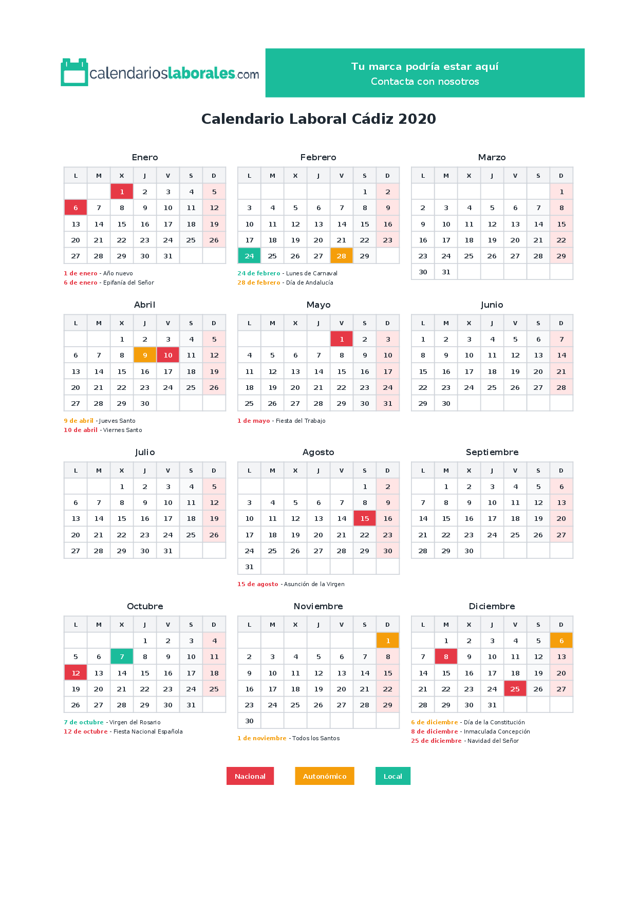 El calendario laboral de Cádiz en 2020 cuenta con un total de 14 días festivos, que incluyen festivos nacionales, festivos autonómicos de Andalucía y los festivos locales establecidos por cada municipio.