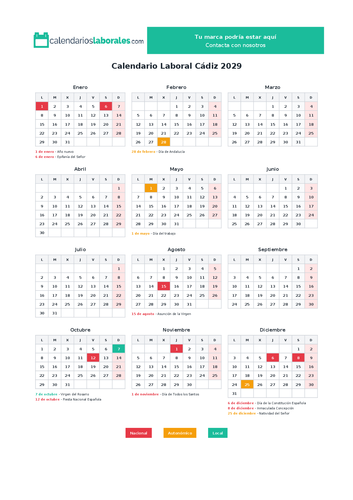 El calendario laboral de Cádiz en 2029 cuenta con un total de 11 días festivos, que incluyen festivos nacionales, festivos autonómicos de Andalucía y los festivos locales establecidos por cada municipio.