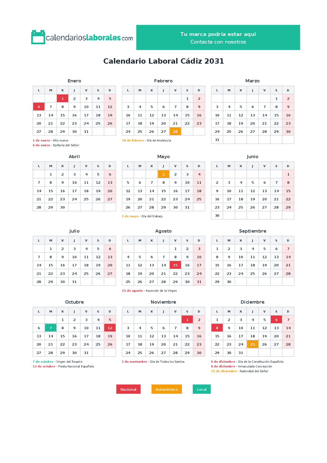 El calendario laboral de Cádiz en 2031 cuenta con un total de 11 días festivos, que incluyen festivos nacionales, festivos autonómicos de Andalucía y los festivos locales establecidos por cada municipio.