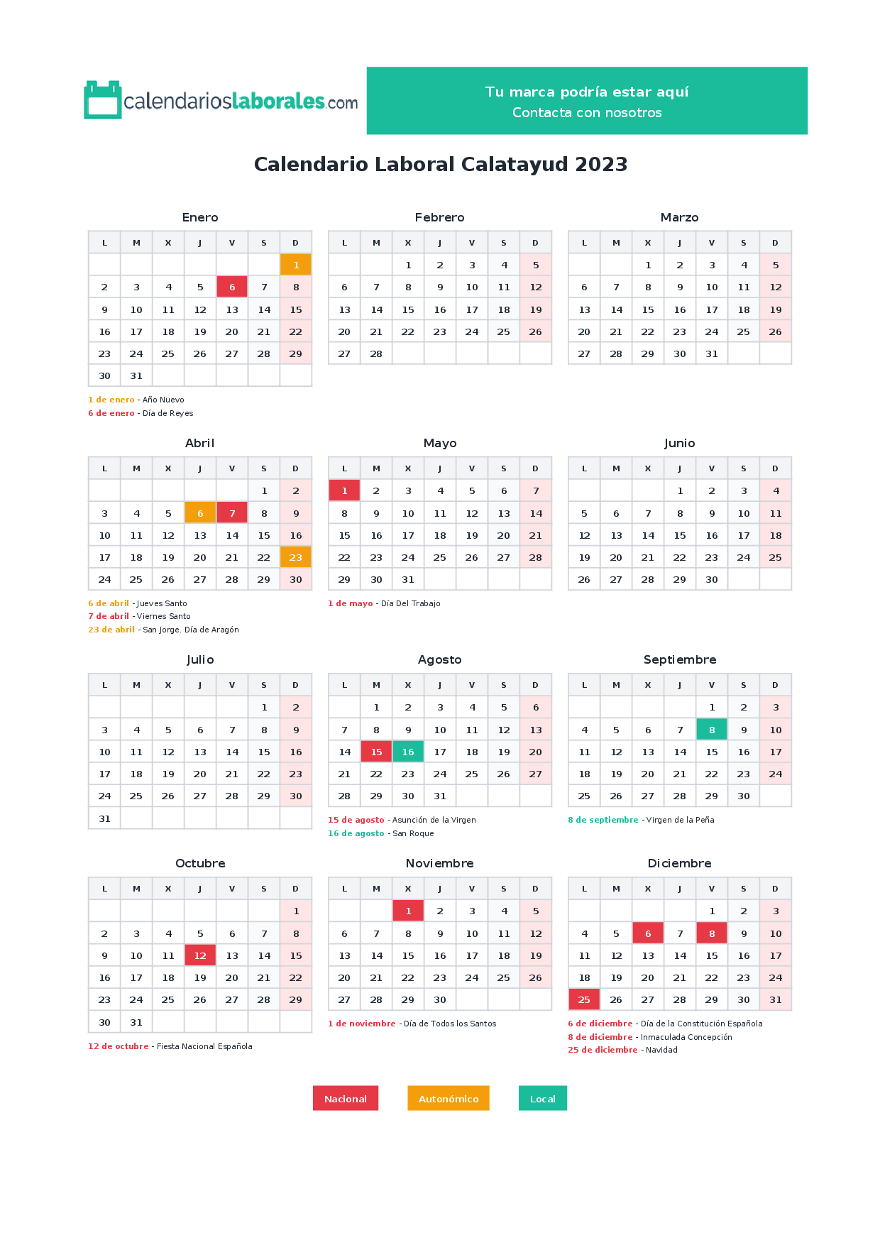 El calendario laboral de Calatayud en 2023 incluye un total de 14 días festivos, que combinan festivos nacionales, festivos autonómicos de Aragón y los festivos locales propios del municipio.