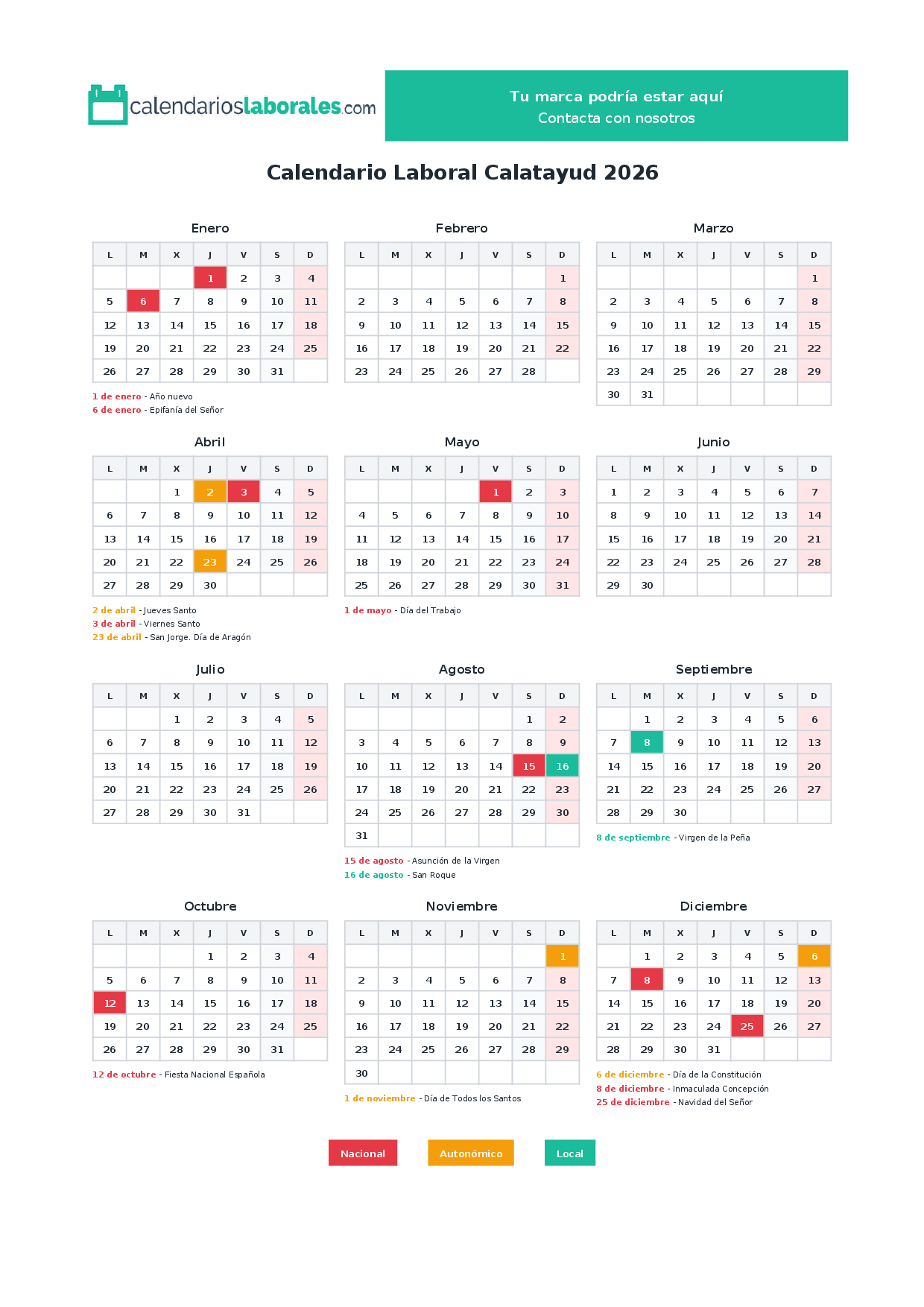 Además, el Ayuntamiento de Calatayud fija 2 festivos locales que completan el calendario laboral del municipio.