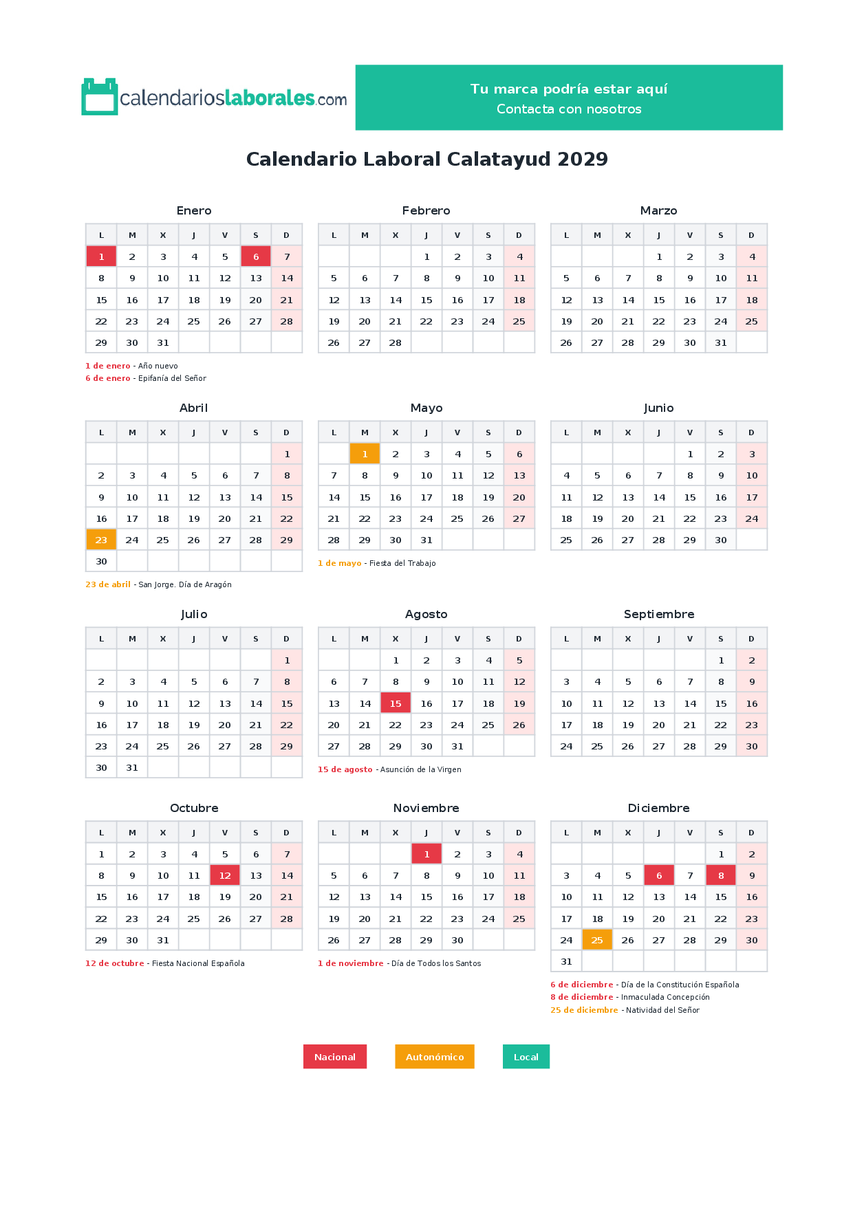 Calendario laboral Calatayud 2029