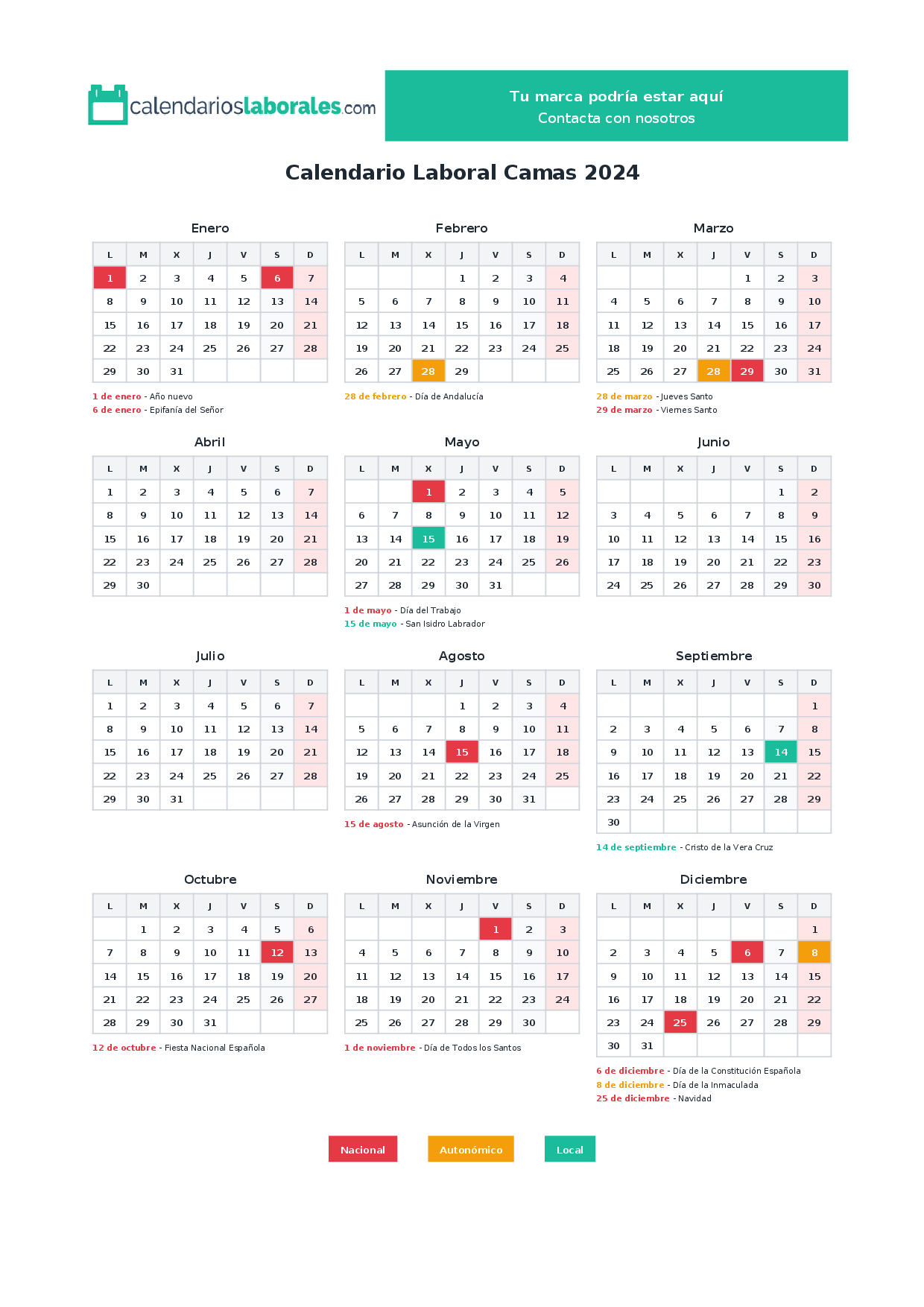 El calendario laboral de Camas en 2024 incluye un total de 14 días festivos, que combinan festivos nacionales, festivos autonómicos de Andalucía y los festivos locales propios del municipio.