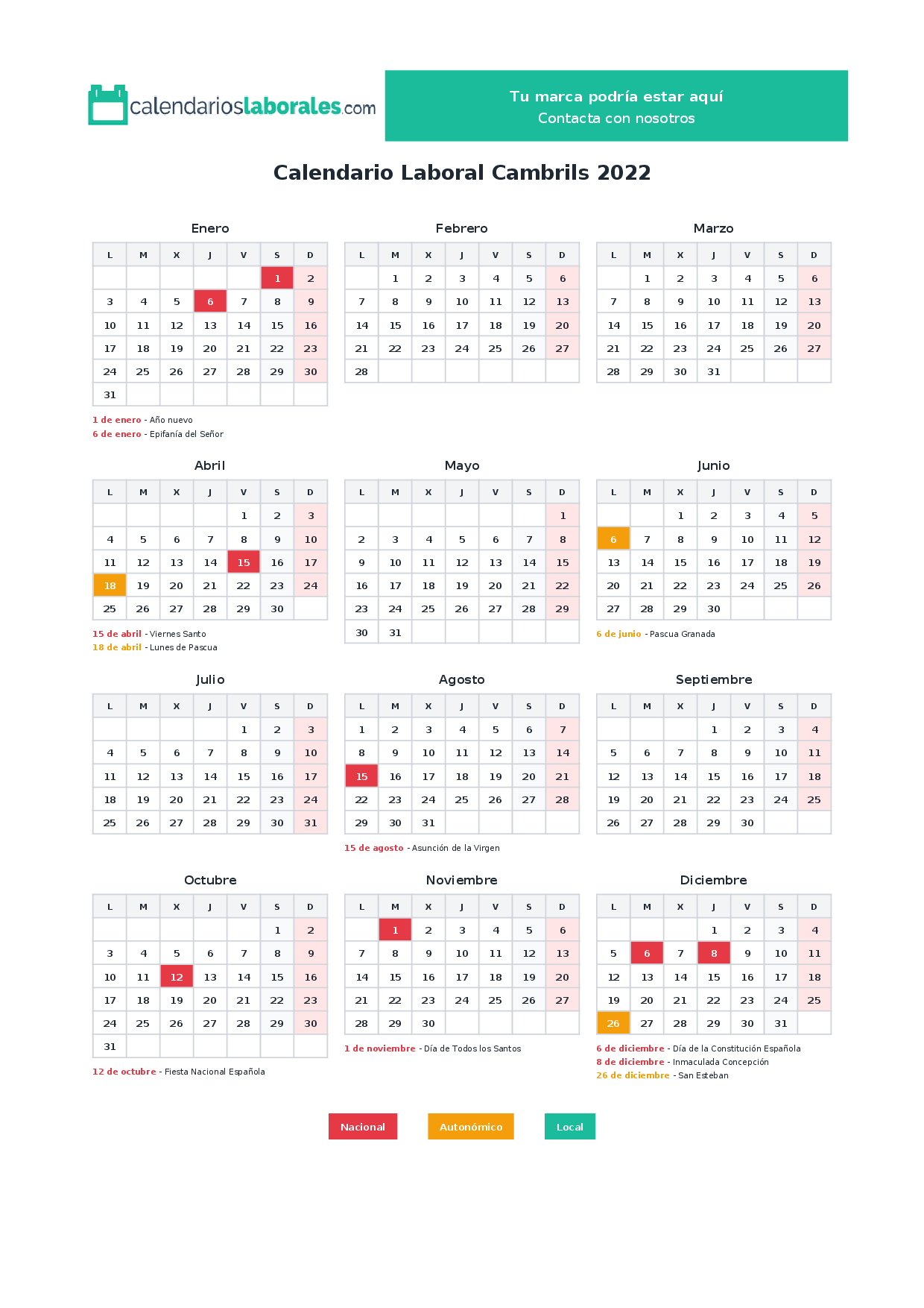 Además, el Ayuntamiento de Cambrils fija 0 festivos locales que completan el calendario laboral del municipio.