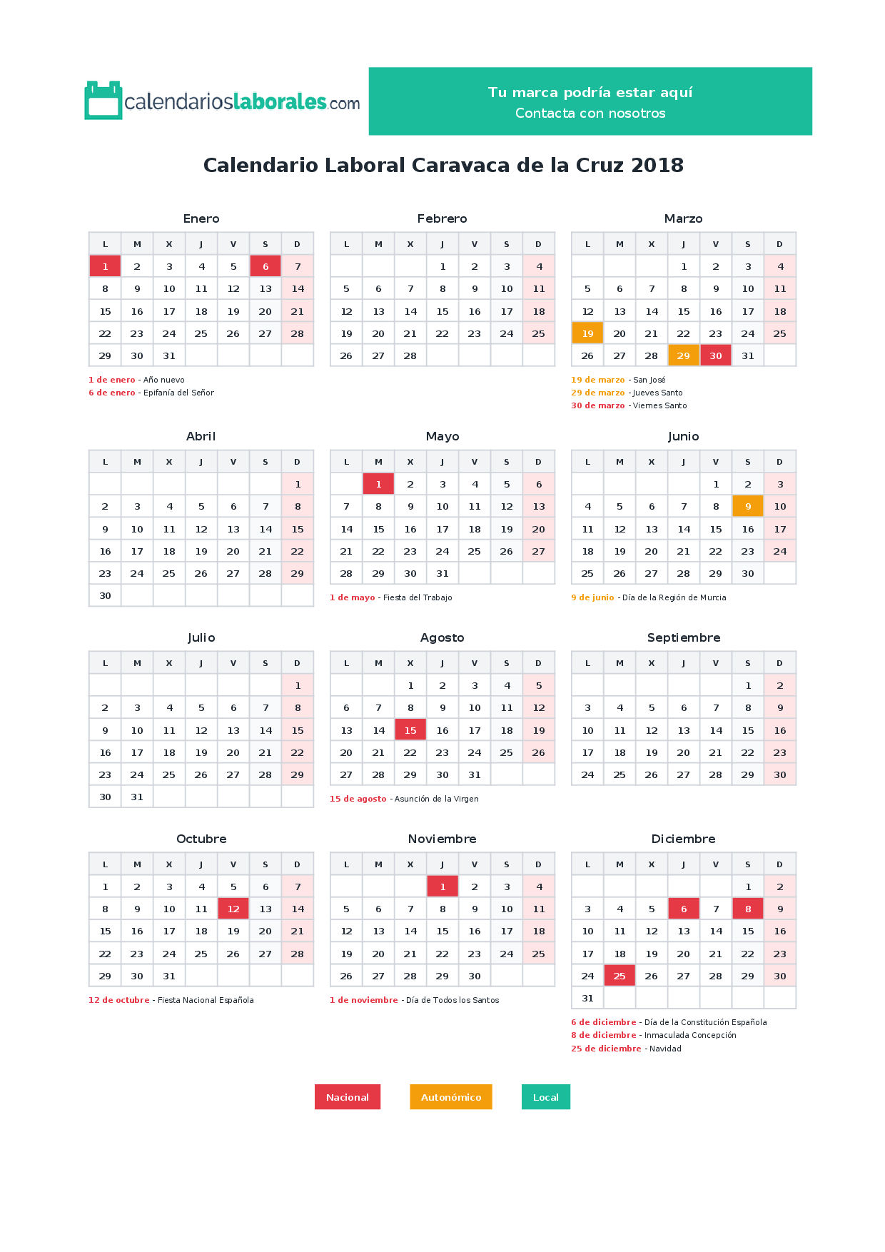En 2018, 10 festivos nacionales se celebran en todo el territorio español, incluidos en el calendario laboral de Caravaca de la Cruz.
