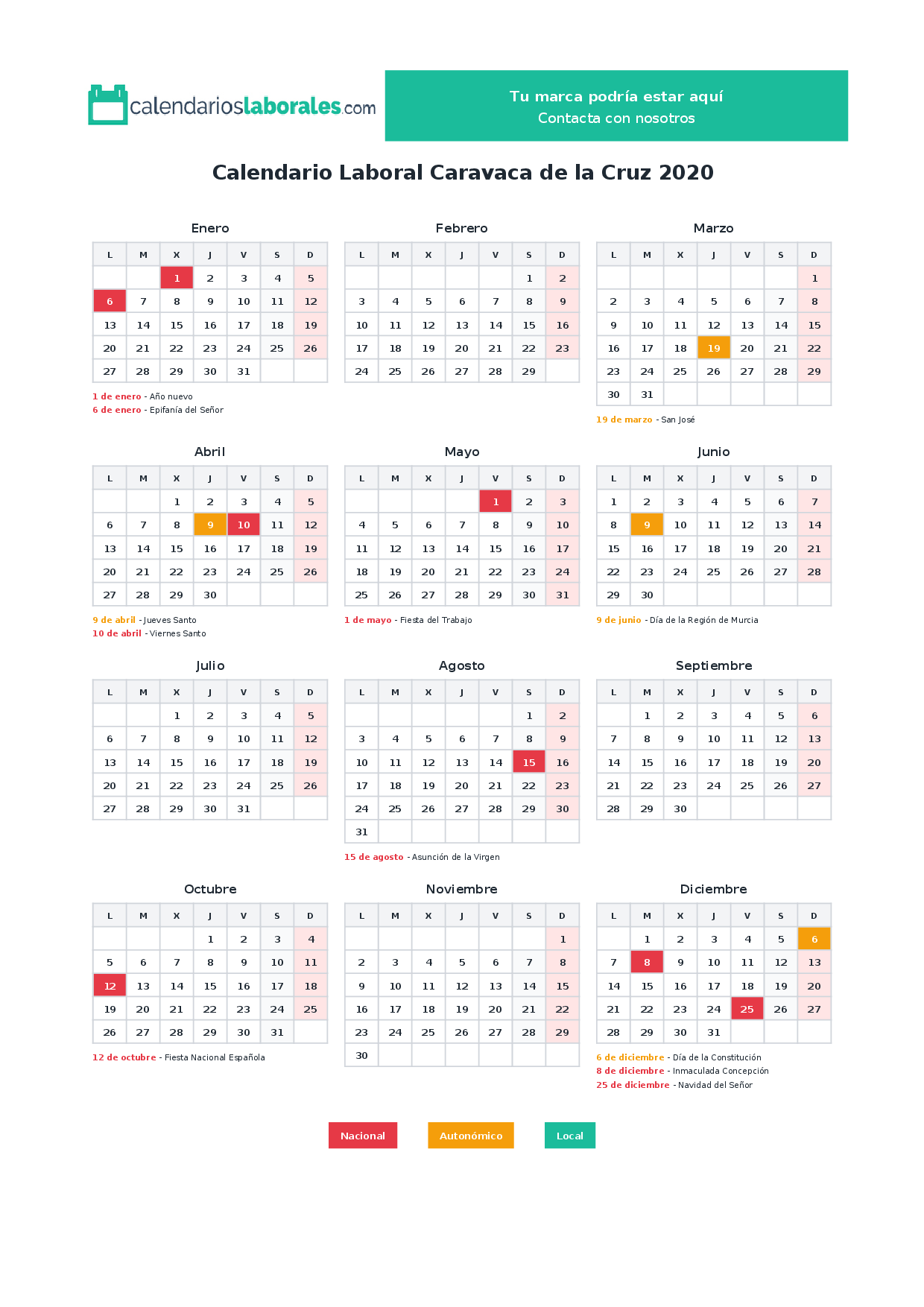 En 2020, 8 festivos nacionales se celebran en todo el territorio español, incluidos en el calendario laboral de Caravaca de la Cruz.