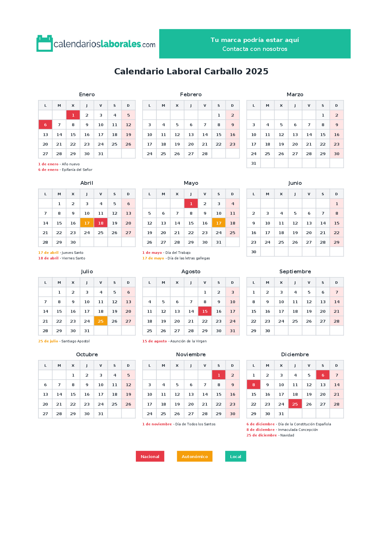 El calendario laboral de Carballo en 2025 incluye un total de 12 días festivos, que combinan festivos nacionales, festivos autonómicos de Galicia y los festivos locales propios del municipio.