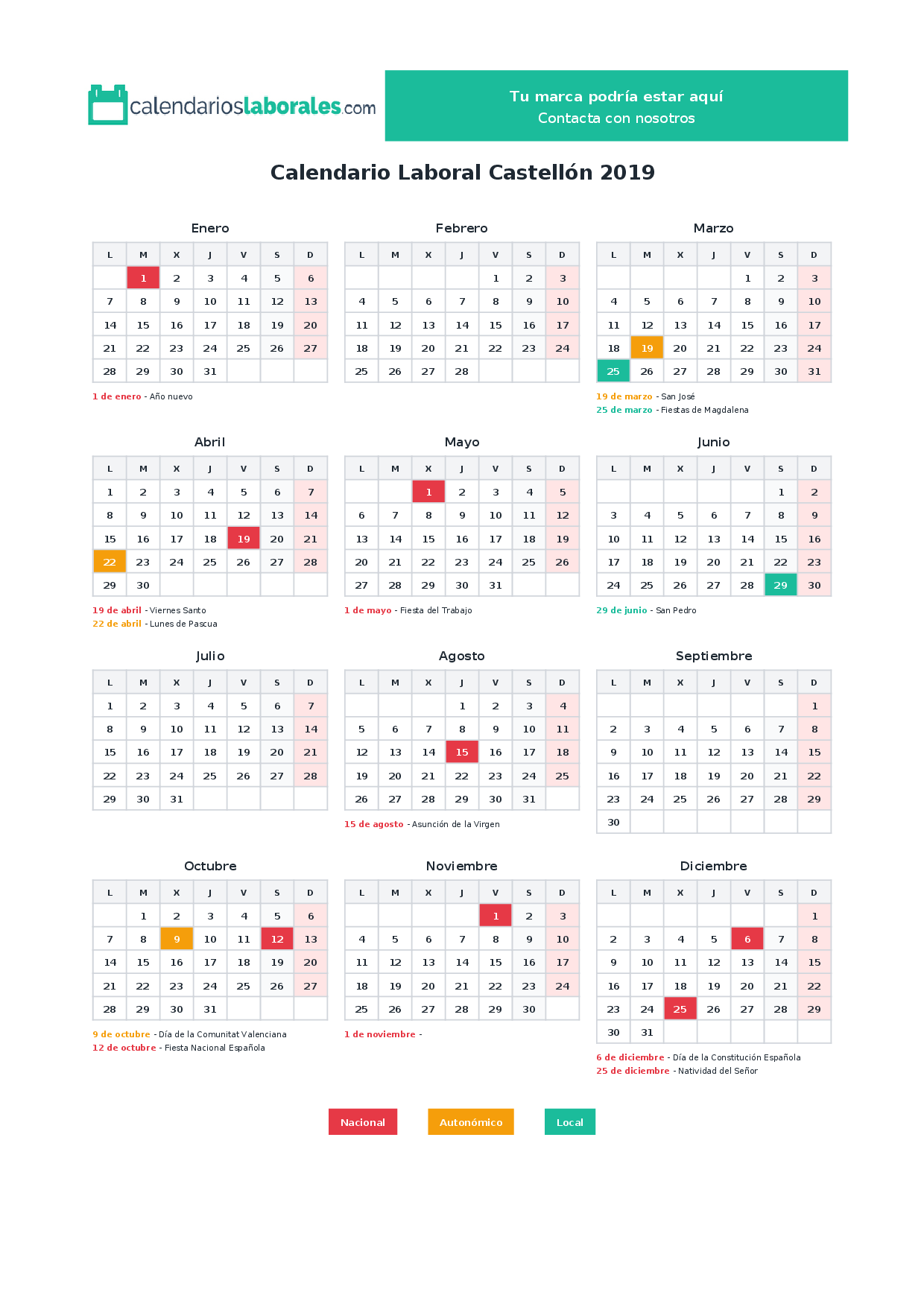 El calendario laboral de Castellón en 2019 cuenta con un total de 13 días festivos, que incluyen festivos nacionales, festivos autonómicos de Comunidad Valenciana y los festivos locales establecidos por cada municipio.