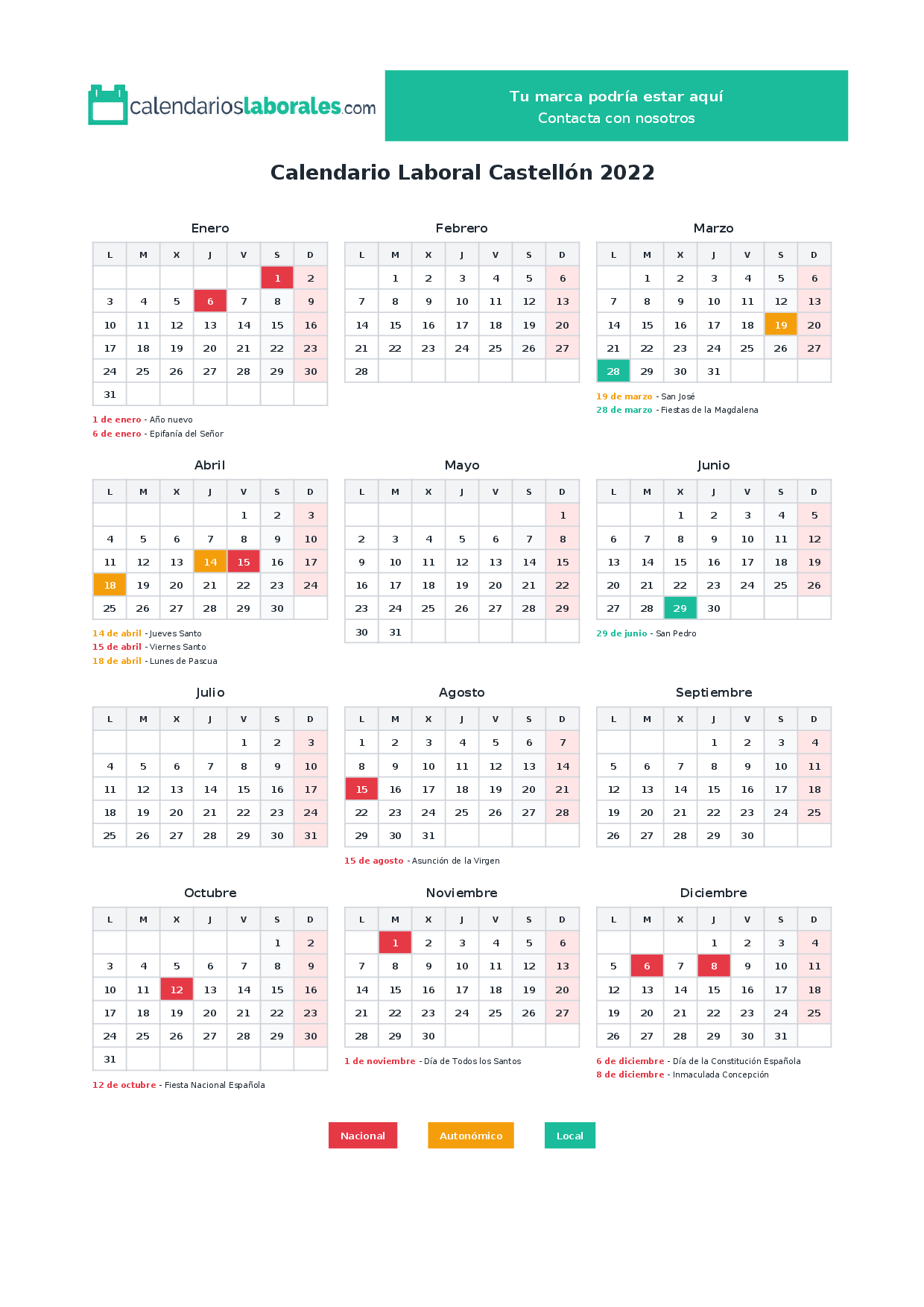 El calendario laboral de Castellón en 2022 cuenta con un total de 13 días festivos, que incluyen festivos nacionales, festivos autonómicos de Comunidad Valenciana y los festivos locales establecidos por cada municipio.