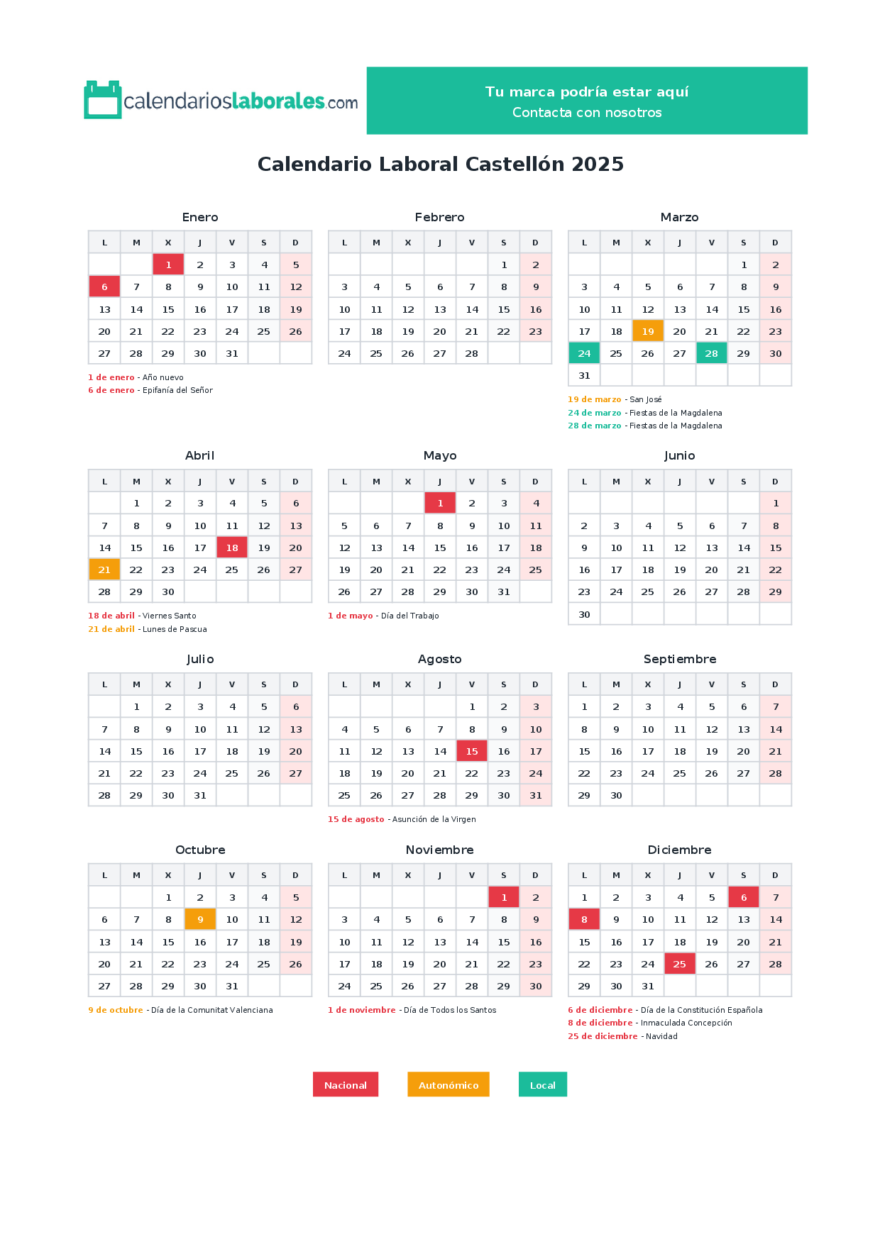 El calendario laboral de Castellón en 2025 cuenta con un total de 14 días festivos, que incluyen festivos nacionales, festivos autonómicos de Comunidad Valenciana y los festivos locales establecidos por cada municipio.