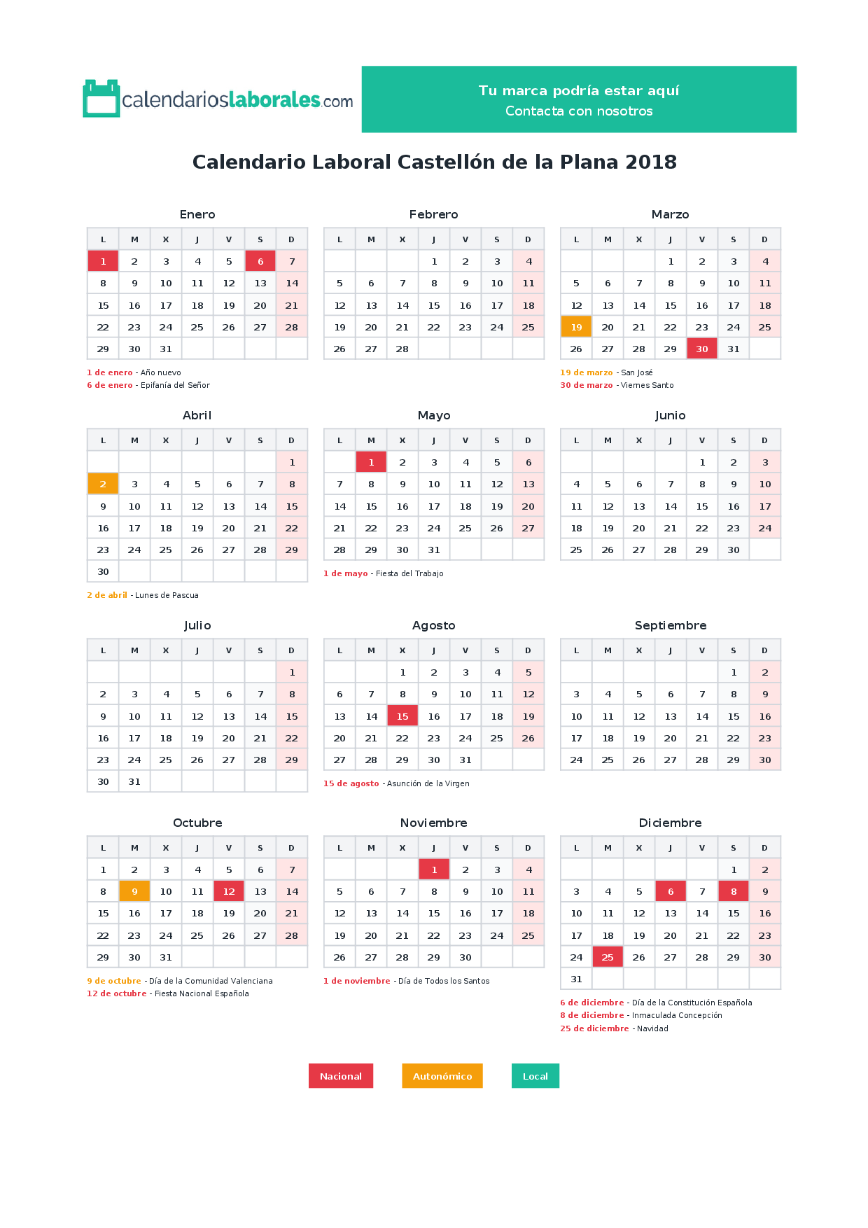 Calendario laboral Castellón de la Plana 2018