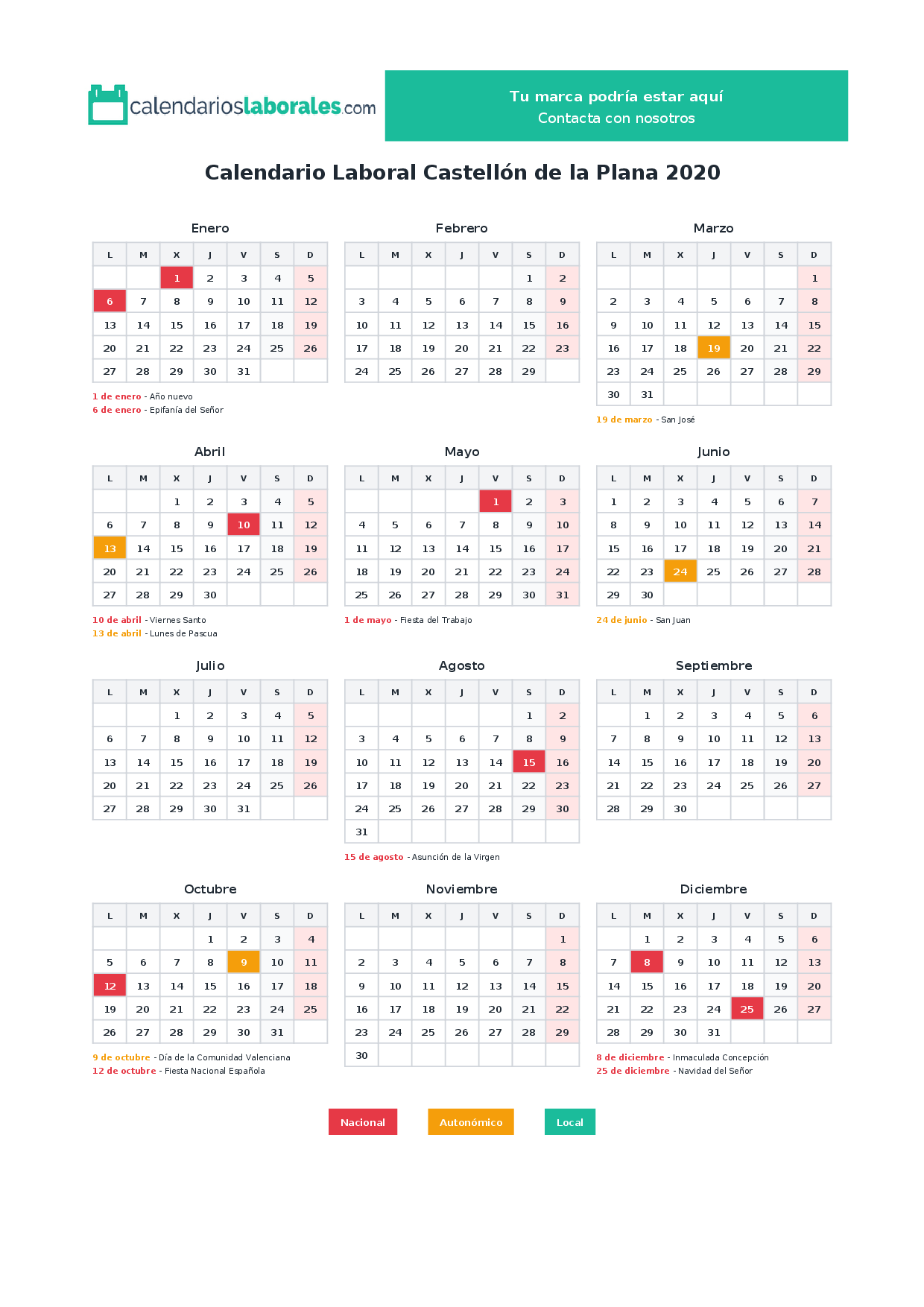 El calendario laboral de Castellón de la Plana en 2020 incluye un total de 12 días festivos, que combinan festivos nacionales, festivos autonómicos de Comunidad Valenciana y los festivos locales propios del municipio.