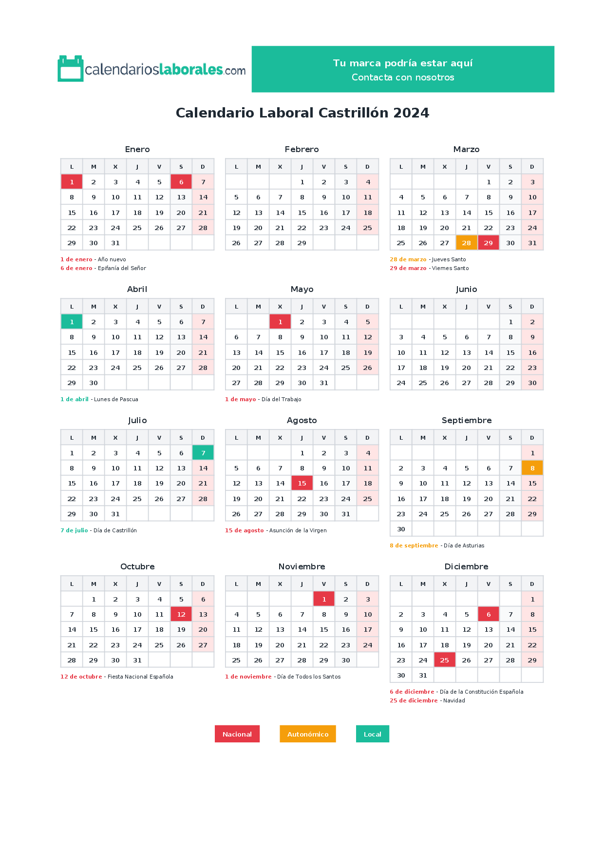 En 2024, 9 festivos nacionales se celebran en todo el territorio español, incluidos en el calendario laboral de Castrillón.