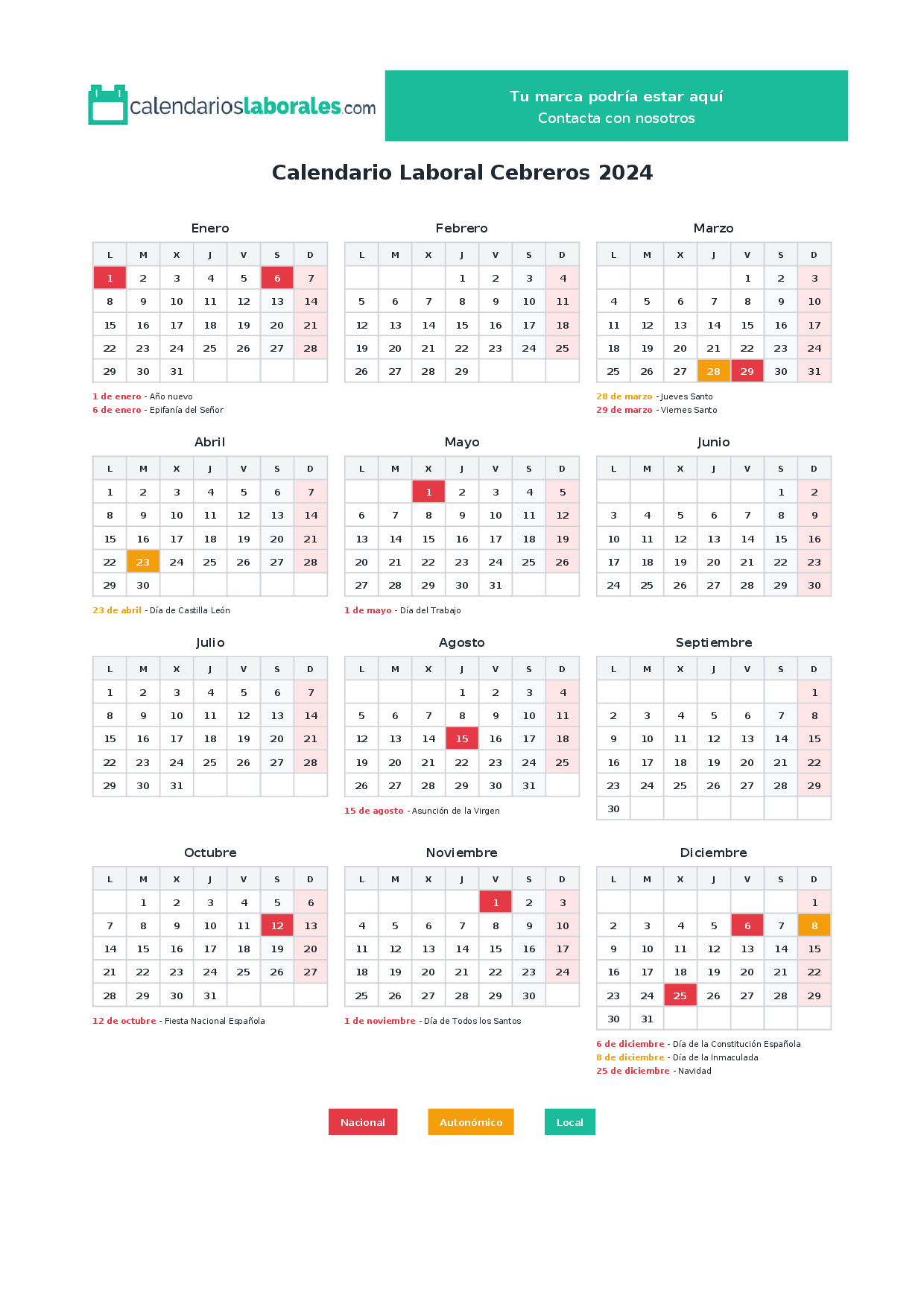 El calendario laboral de Cebreros en 2024 incluye un total de 12 días festivos, que combinan festivos nacionales, festivos autonómicos de Castilla León y los festivos locales propios del municipio.
