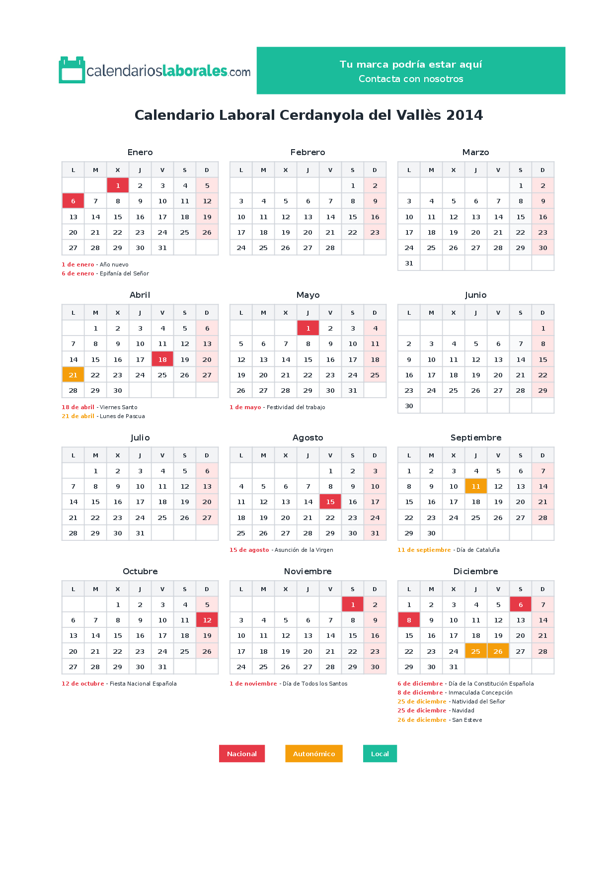 En 2014, 10 festivos nacionales se celebran en todo el territorio español, incluidos en el calendario laboral de Cerdanyola del Vallès.