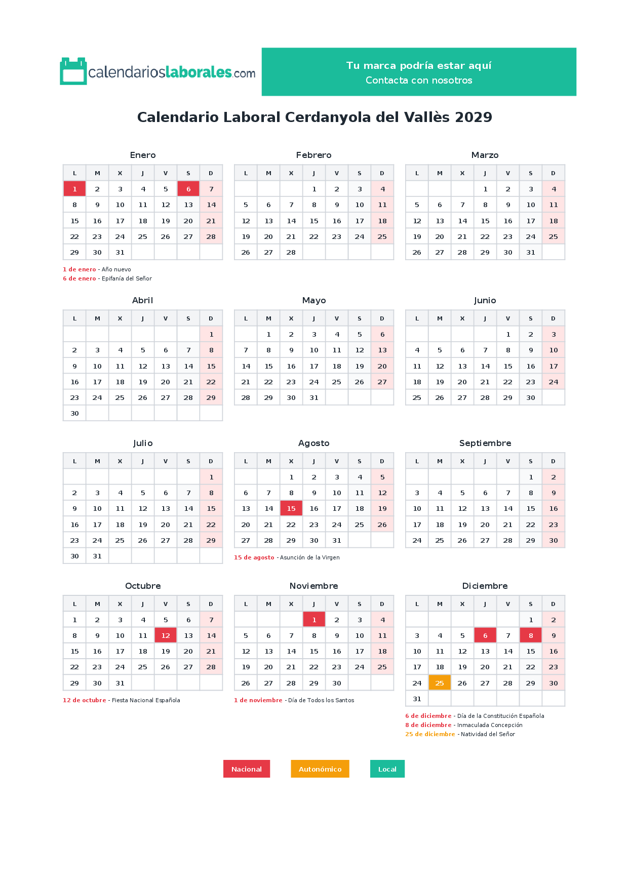 En 2029, 7 festivos nacionales se celebran en todo el territorio español, incluidos en el calendario laboral de Cerdanyola del Vallès.
