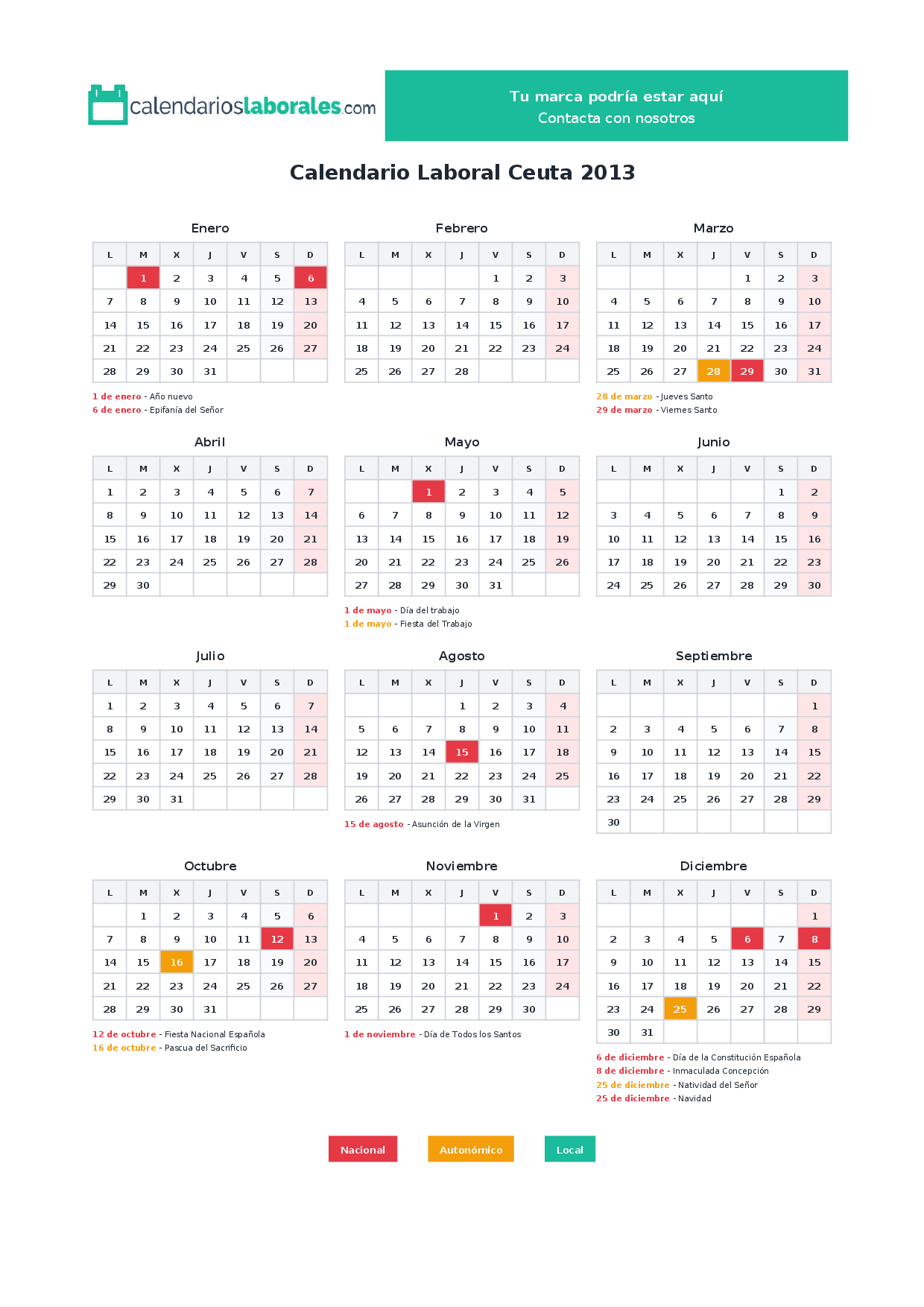 En 2013, 10 festivos son comunes en todo el territorio español y también se aplican en Ceuta.