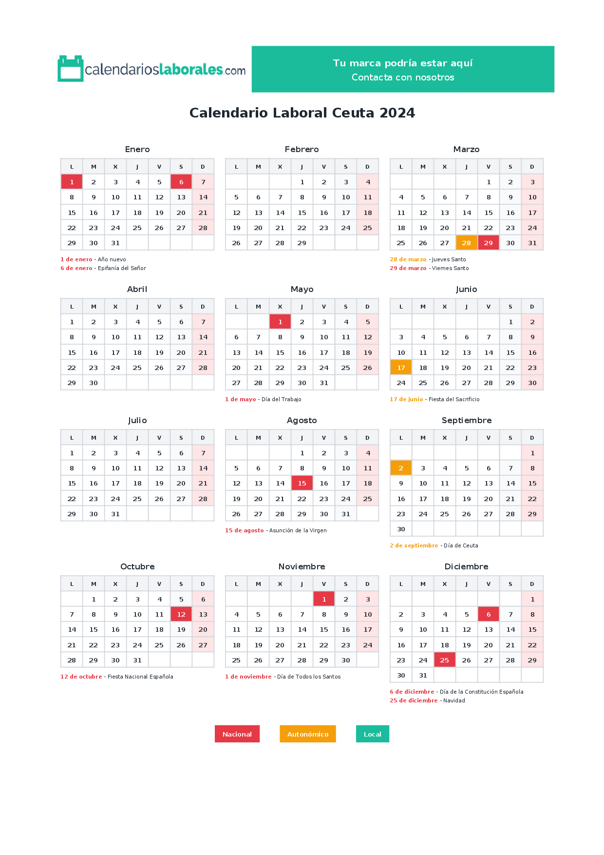 El calendario laboral de Ceuta en 2024 incluye un total de 12 días festivos, que combinan festivos nacionales y festivos autonómicos establecidos por la comunidad autónoma.