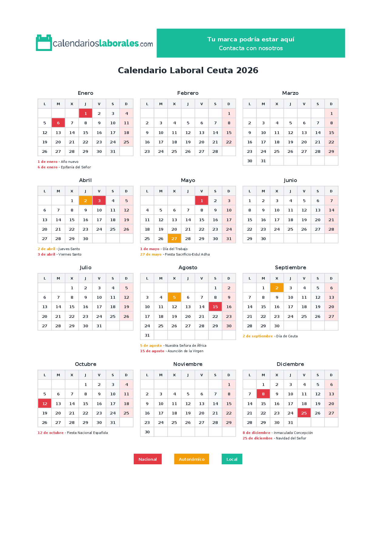 El calendario laboral de Ceuta en 2026 incluye un total de 12 días festivos, que combinan festivos nacionales y festivos autonómicos establecidos por la comunidad autónoma.